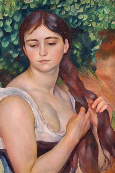 A copf című csoda szép festményen egy fiatal nő fonja be hosszú haját gondolataiba merülve, kissé oldalra fordított fejjel. Úgy tűnik, készül valahová, vagy csak éppen megfürdött. Alakját sűrű bokrok keretezik. A huszonegy éves Suzanne Valadon ült modellt Renoirnak ehhez a festményhez; később maga is festő lett. Az alkotást a Renoirra jellemző realisztikus festésmód jellemzi, rendkívül tiszta formák és vonalak, határozott kompozíció, finom részletező megoldások, melyek különösen a levelek zöldjében érhetők tetten. A kép mégis impresszionista, nagyon is az. Hiszen az impresszionizmus is a realizmus talaján jött létre. Maga Cézanne, a modern művészet előfutára is azt vallotta, hogy a tervezett kompozíció elengedhetetlen a mű megalkotásakor.