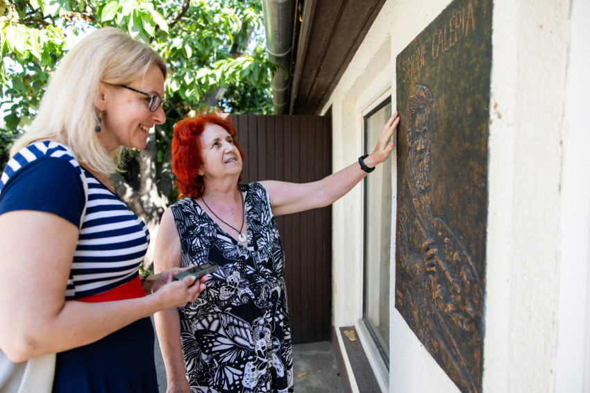 „Harminc éve festek, gyakorlatilag csak ezzel foglalkozom. Azért költöztünk ide, hogy legyen egy kis műhelyem” – mondja Veronika mindjárt a beszélgetésünk elején, és egy kis épülethez vezet minket, amely a telek hátsó részén áll, a konyhakert mögött. A bejáratánál egy szép, nagy méretű dombormű. „2013-ban készítettem, vemati technikával, amit a művésztársaimmal fejlesztettük ki. A nevét rólunk kapta: Veronika, Magdi és Tibor. Ezt a domborművet nem lehet ellopni, mert össze van építve a fallal, eső-, hőség- és szélálló” – magyarázza, majd megmutatja, hogy a lakóház verandáján egy szobra áll, a domborművek készítése ehhez a művészeti ághoz is meghozta a kedvét.
