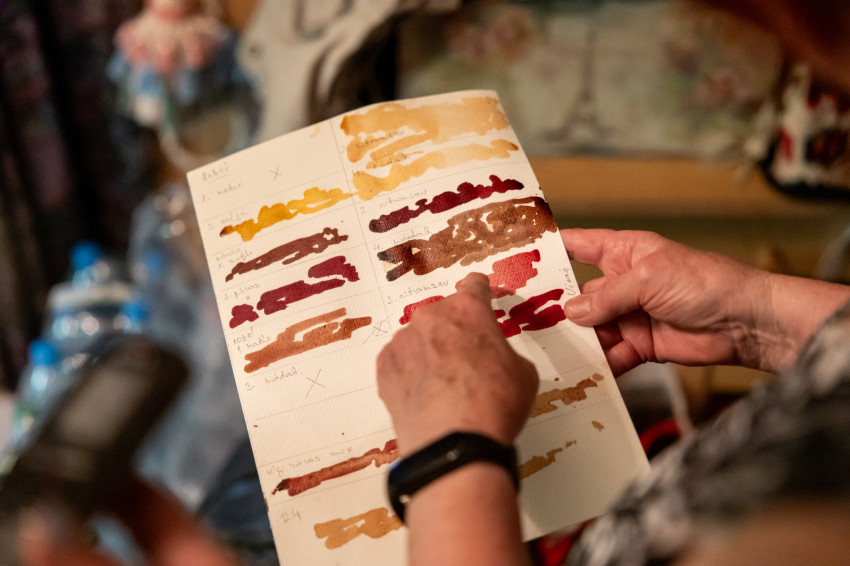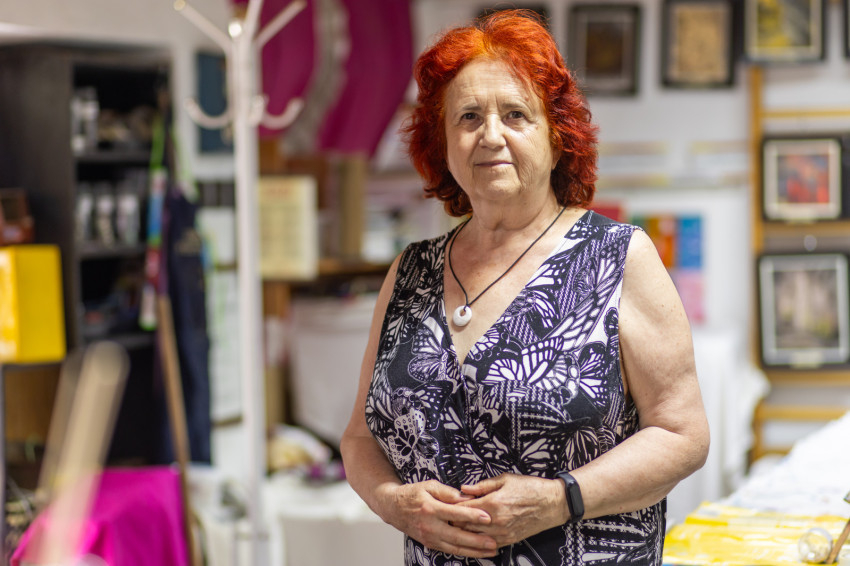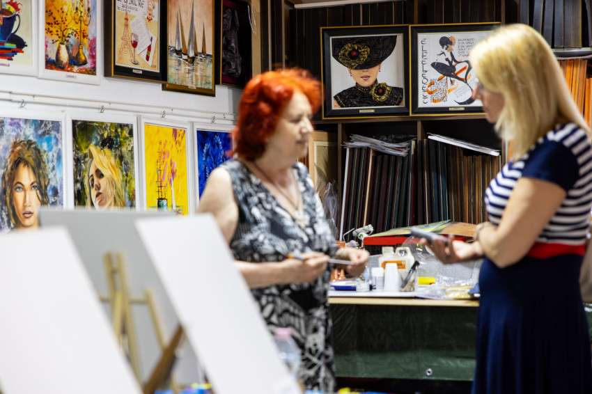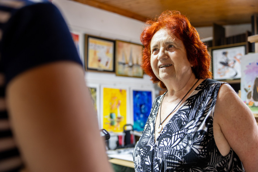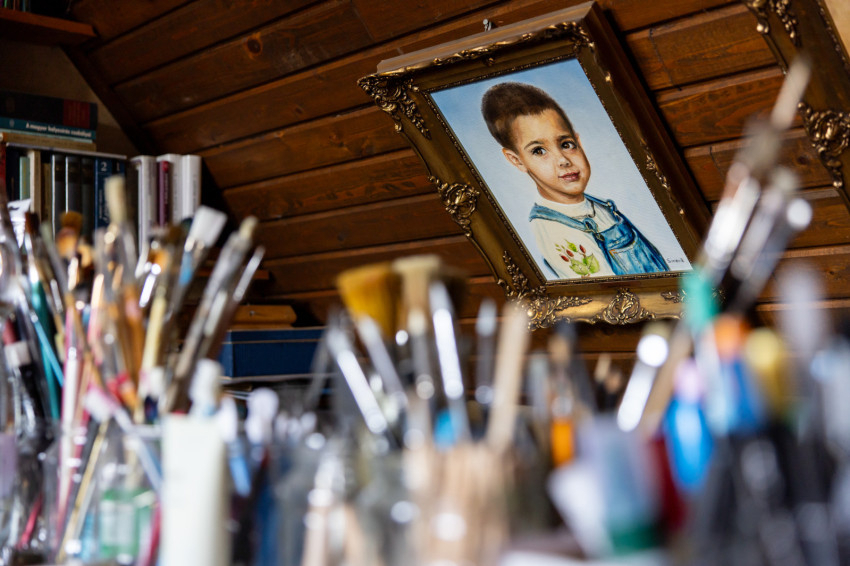 A kis műhely telis-tele festményekkel, a polcokon mint a könyvek sorakoznak a keretezett képek. A falon egyetlen négyzetméternyi hely sincs már, az asztalra pedig festővásznak vannak kikészítve szépen sorban, mintha a hét törpének lenne megterítve az asztal, csak éppen nem étkezéshez, hanem festéshez. „Itt, ebben a műhelyben tanítom a gyerekeket. Mindig előre megfestem nekik a mintaképet, most ez a kutya lesz a következő foglalkozás témája, ezt választották. A kicsik utánozzák a kutyaformát, de minden mással ők egészítik ki a festményüket, a színvilágban is engedem, hogy kiteljesedjenek.”
