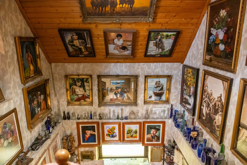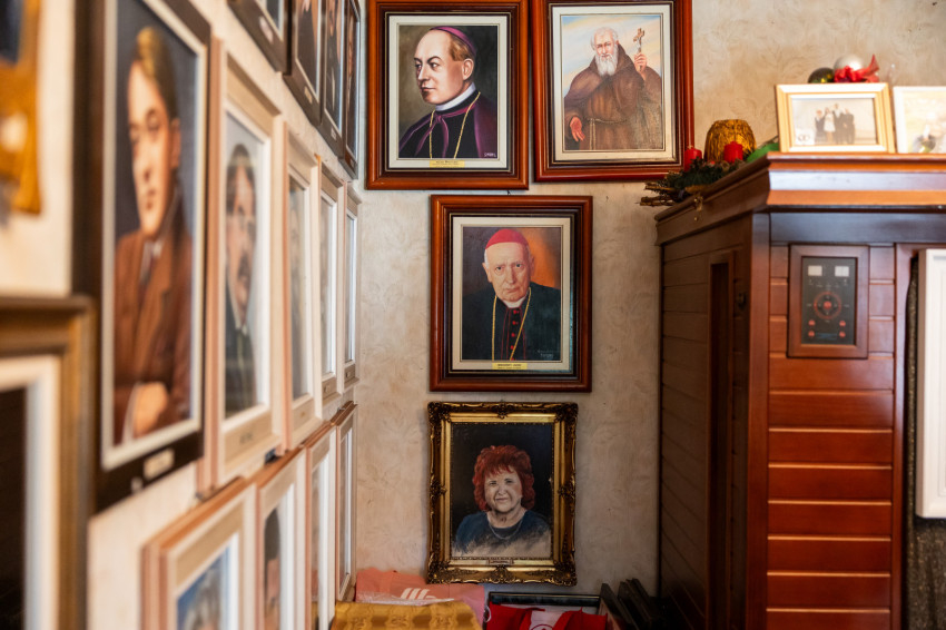 Bemegyünk a házba, ahol már az előtér és a lépcsőforduló is tele van festményekkel. Itt kaptak helyet a pápaképek is, többféle verzióban, pasztellképek, amelyek Veronika szerint csak vázlatok. „Az igazi festmény nekem az olaj. Amikor a Louvre-ban láttam, hogy 1600-ból is vannak pasztellképek, egészen megdöbbentem. Temperával készült az első művem, de mindenféle technikát szeretek, még borral is festünk.”