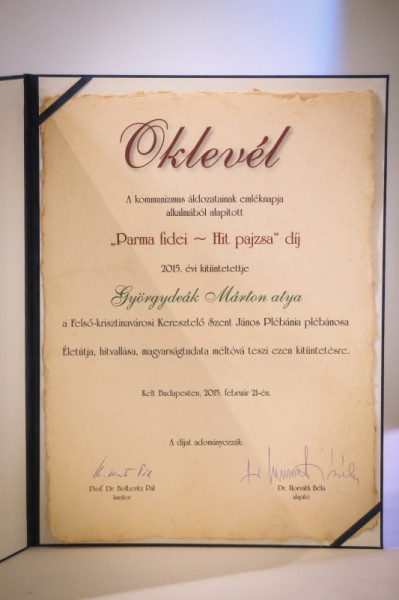 A Parma fidei az életutat és az egyenes gerincet díjazza – fogalmazott ünnepi köszöntőjében Kocsis Máté, Budapest VIII. kerületének polgármestere. Az előző rendszer üldözése ellenére sokan hűségesek maradtak hitükhöz és magyarságukhoz – tette hozzá, majd generációja tiszteletét tolmácsolta ezeknek a példaképeknek, köztük a Hit pajzsa díjazottjainak. Kocsis Máté kiemelte a Józsefvárosban született Györgydeák Márton közösségépítő, emberhalászi szerepét.