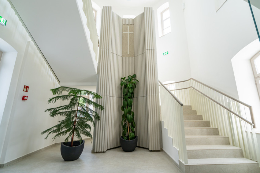 Az óvoda központi épülete és az új épületrészben helyet kapó csoportszobák közvetlen kertkapcsolattal rendelkeznek, kedvező tájolással és racionalizált kialakítással. A katolikus szellemiség erősítésére kápolnát is kialakítottak.