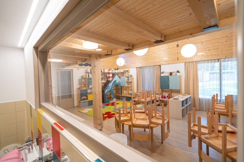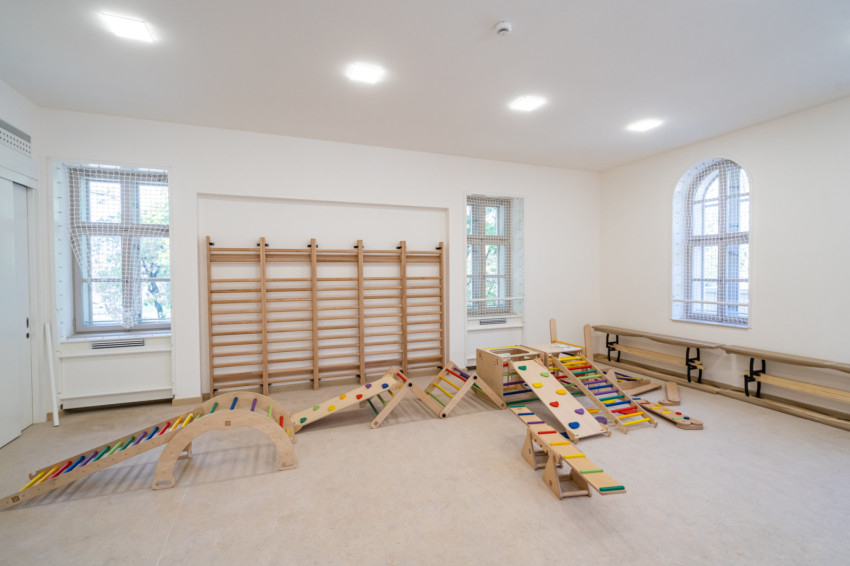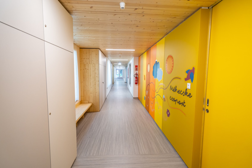 A négycsoportos óvoda csoportszobáit a Kiskastély épületéhez kapcsolódó, újonnan megépített északi és déli szárnyban helyezték el.