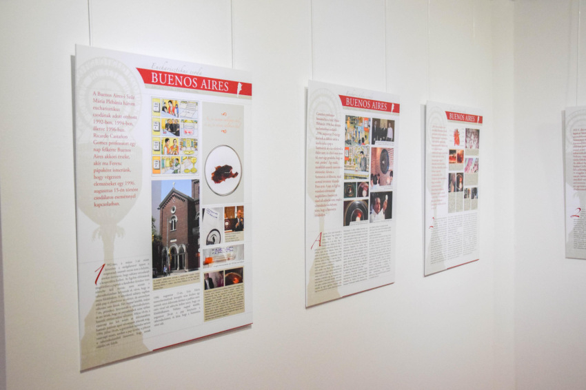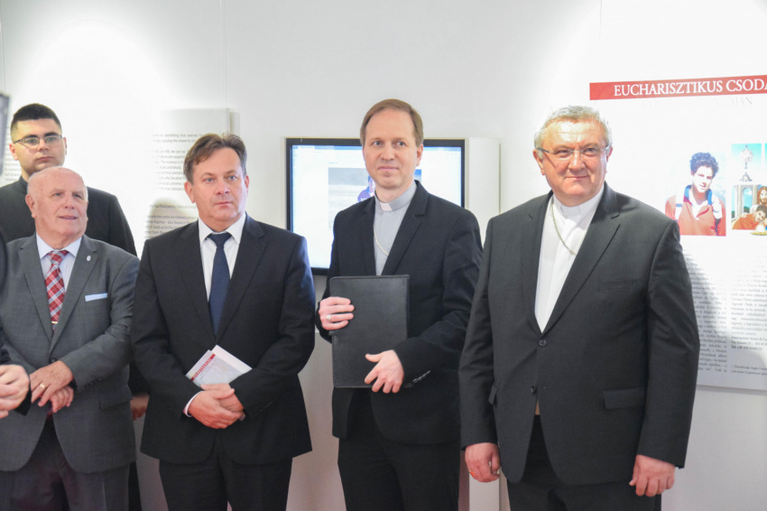 Keresztény életünk középpontjában az „angyalok kenyere”, vagyis az Oltáriszentség áll – hangsúlyozta a megnyitón Veres András megyéspüspök. – A szentmisében átlényegülés, transzszubsztanciáció történik Jézus szavainak megismétlésével: „ez az én testem”, „ez az én vérem”. A konszekrálás után lényegileg már nem a kenyér és a bor, hanem Krisztus teste és vére áll előttünk. Nem fizikai, hanem lényegi változás megy végbe. Erről a misztériumról vall ez a kiállítás, az Egyház által kivizsgált és elismert eucharisztikus csodákon keresztül is.