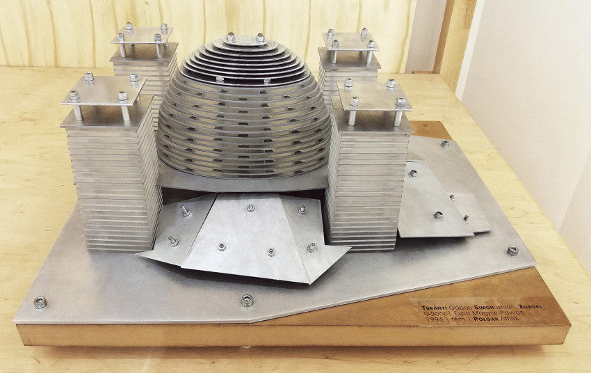 A Vigadó Galéria kiállításának sok érdekessége közül végül nézzünk meg egy másik felhőkarcolótervet, a magas épületek iránt rajongó olvasóink kedvéért. Kismarty-Lechner Kamill (1914–2003) nem is egy, hanem mindjárt két magasházat tervezett az Astoriához 1970-ben, a Műszaki és Természettudományi Egyesületek Szövetsége (MTESZ) székházának tervpályázatára. (Ezen a telken ma a Zalaváry Lajos tervezte East-West Business Center áll.) A terv utópisztikus volt, a hengeres, fölfelé keskenyedő tornyok formája aligha alkalmazkodott volna a belvárosi beépítéshez. Nem is ért el helyezést a tervpályázaton.