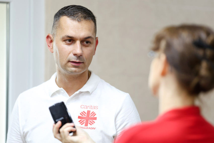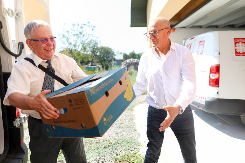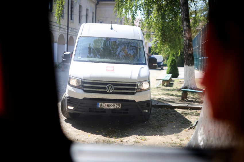 A látogatás következő állomása a nagyszőlősi karitász központja volt, ahol népkonyha működik. Német Sándor igazgató fogadja a magyar vendégeket. Éppen építkezés folyik, felújítják a gyulafehérvári karitász támogatásával azt a régi épületet, melyben Belső-Ukrajnából érkezett menekülteknek tudnak lakhatást biztosítani. Megkezdődik a kirakodás. Innen fogják a többi iskolatáskát kihordani a falvakba, és itt rakják le a higiéniai és kórházi eszközöket, melyeket a frontvonalban lévő kórházakba juttatnak el a nagyszőlősiek.