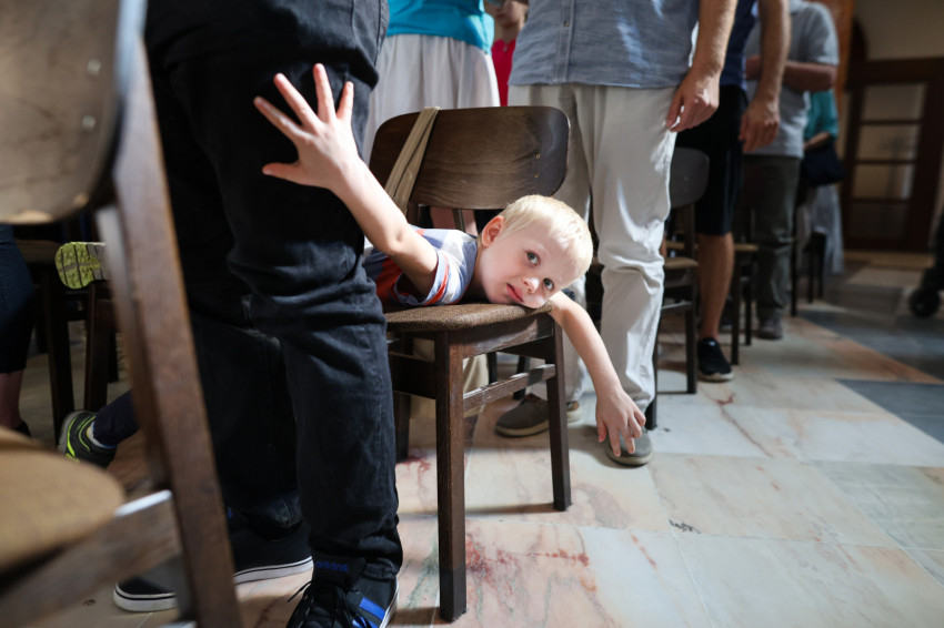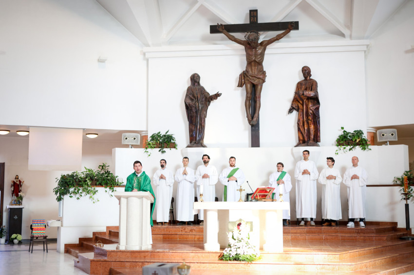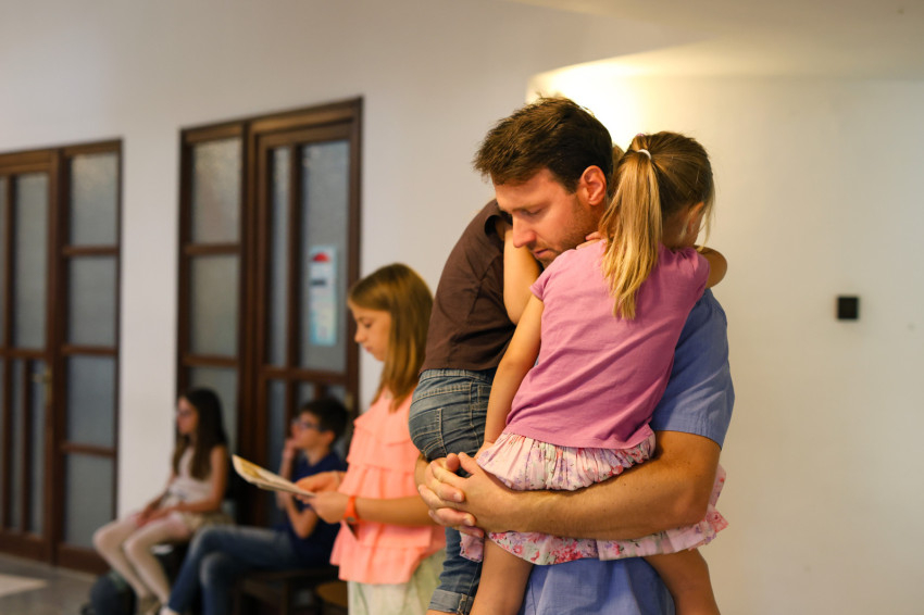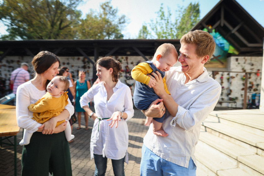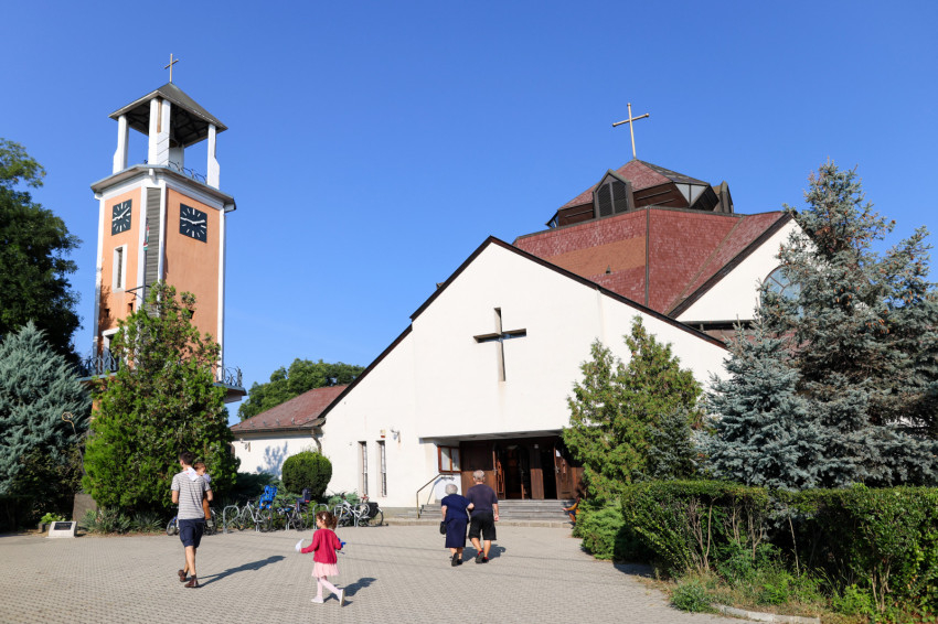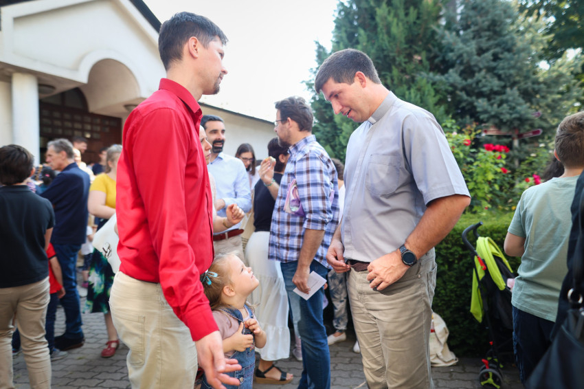 Nyíri Szabolcs húsz éve ebbe a templomba jár a családjával, öt gyermeke – van köztük óvodás és egyetemista is – szorosan kapcsolódik a korosztályának megfelelő csoporthoz. Szabolcs, aki a plébániai képviselő-testületben az evangelizációs munkacsoportot vezeti, egyike azoknak, akiket Kelemen Imre atya összehívott a plébániát bemutató beszélgetésünkre. A plébánosi lakásban ülünk. Itt van még Riesz Domonkos káplán, Piukovics Dániel, aki idén augusztusban kezdte meg a diakónusi szolgálatát, és Gerő Emese, a Márton Áron Cserkészcsapat parancsnoka. Jó a hangulat, sok a nevetés, egymás szavába vágva mesélnek.