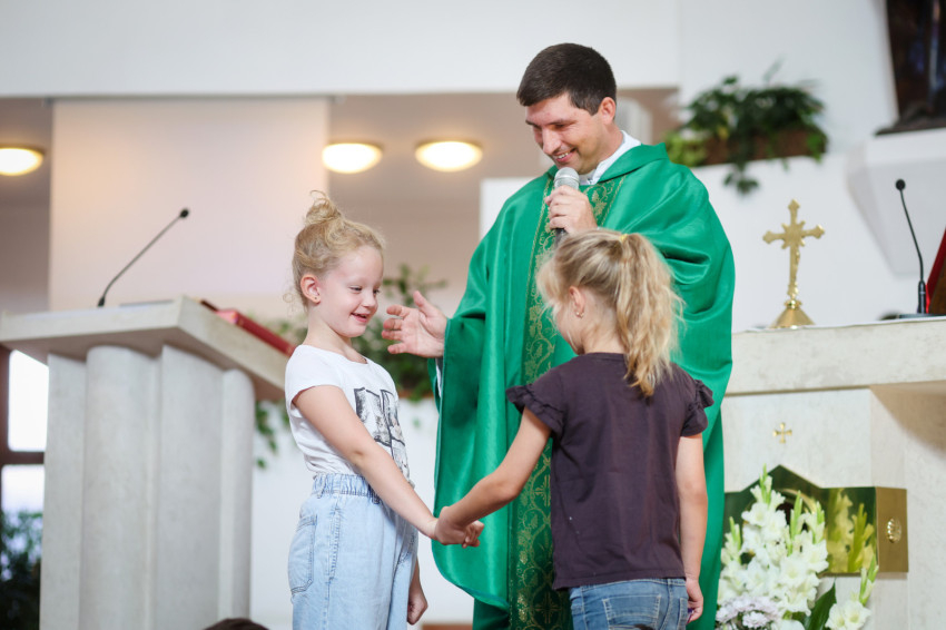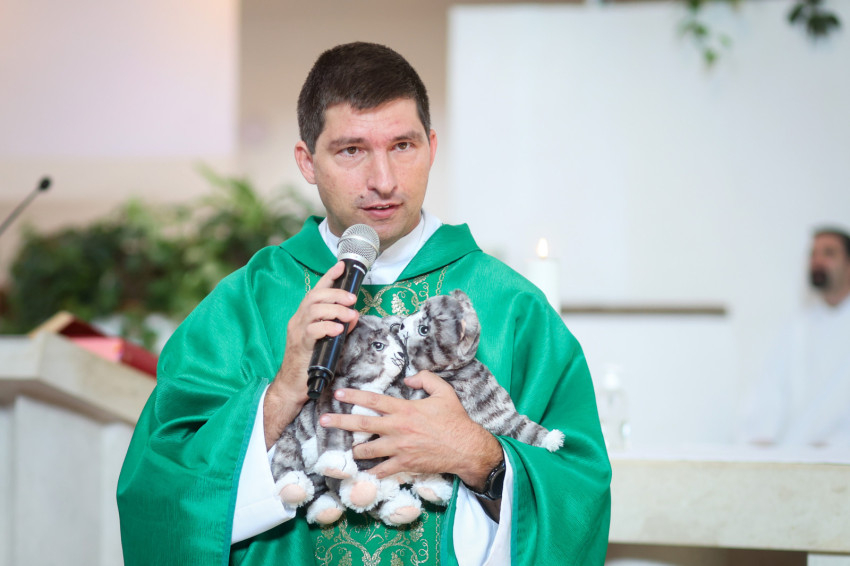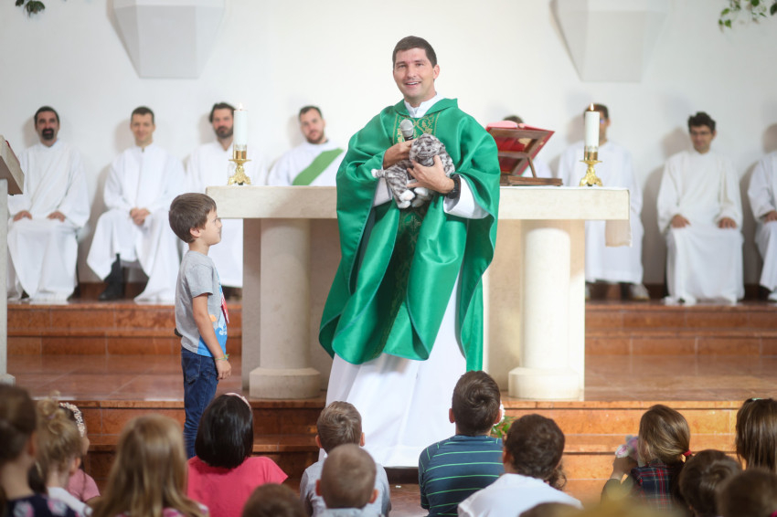 Előkerül három plüsscica is, azután elkezdődik a prédikáció. A plébános kérdez, és a sok-sok gyermekválaszból bontakozik ki a mondanivaló. A szentmise után pedig folytatódik a beszélgetés, hiszen a plébánia kertjében agapé van.