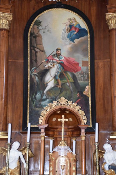 A szentély falán egy újabb festés a Szentháromságot ábrázolja. A barokk, fából készült, restaurált főoltárépítményt középen timpanon koronázza; közepén sugárkoszorúban Istenszem. Az oltárépítményt két oldalt egy-egy oszlop fogja közre. A főoltárkép 1834-ben készült, Pesky József alkotása. A fehér lovon ülő szent király a jobbjában tartott lándzsával a sziklába szúr, és vizet fakaszt belőle.
