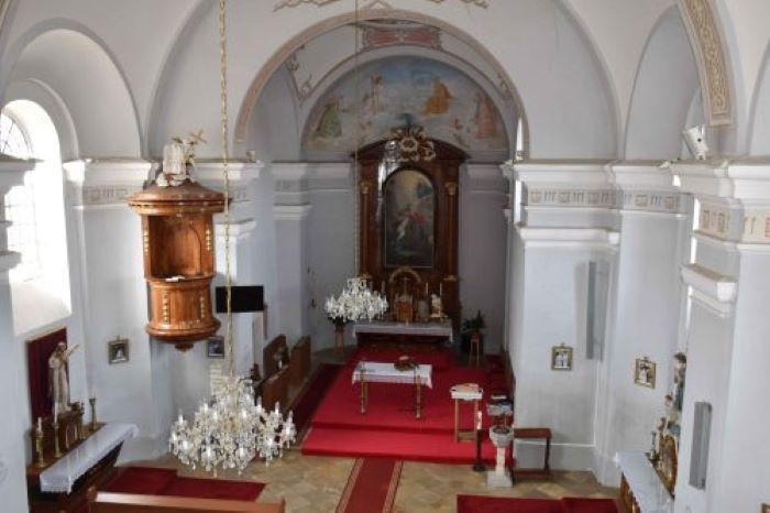 Az erősen restaurált fa szószék szintén az 1830-as évek munkája lehet. A csehsüveg-boltozatos sekrestyébe egy tagolt szalagkeretes ajtón lépünk be, onnan vezet fel lépcső a szószékre.