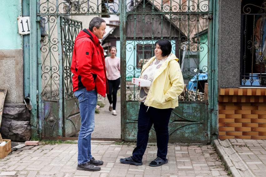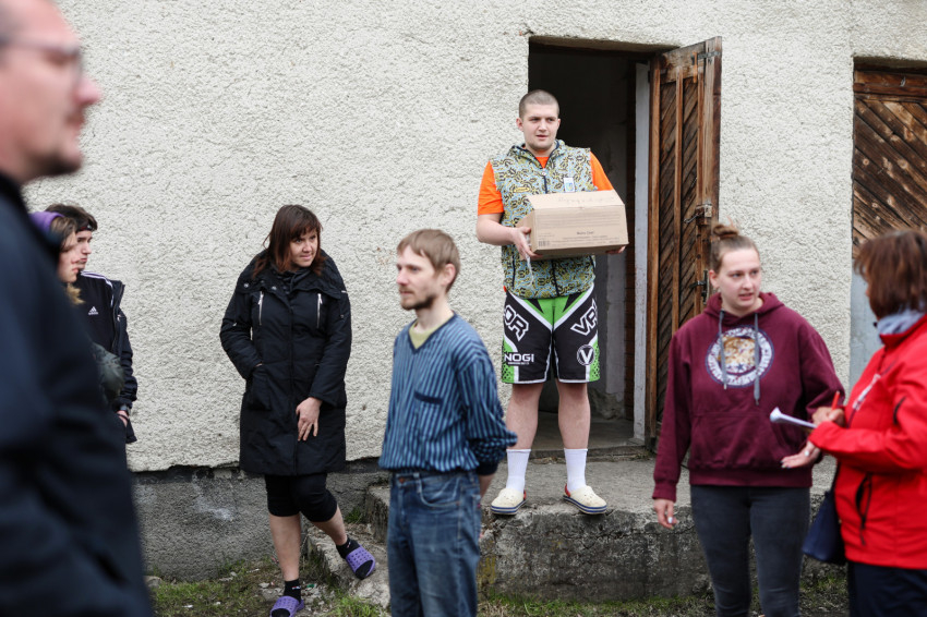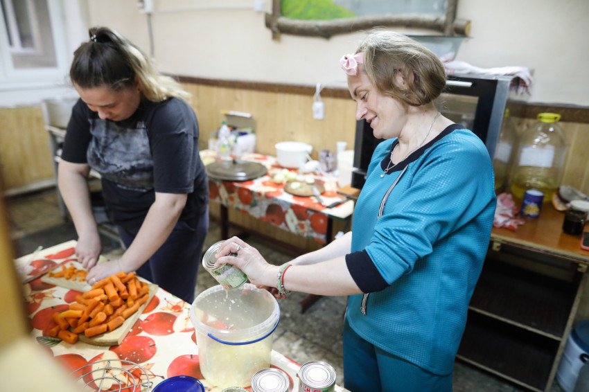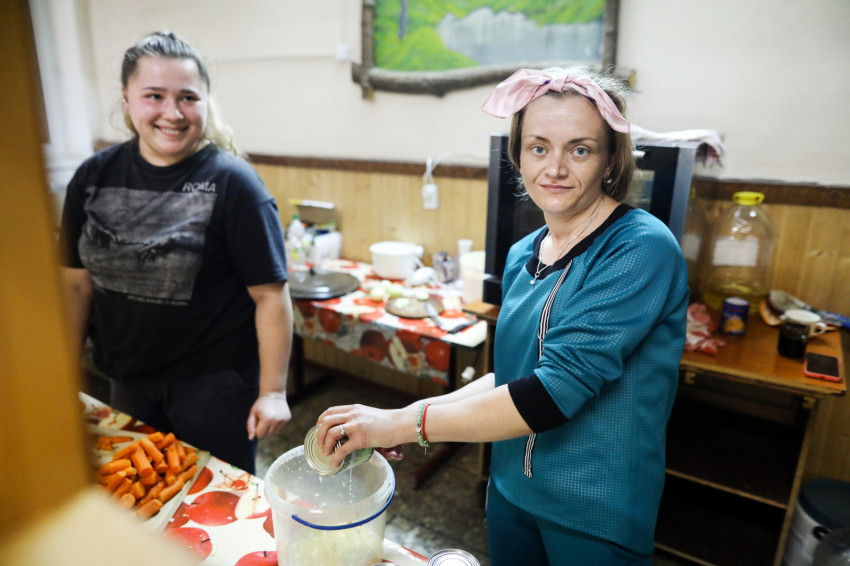 A konyhán háromszáz adag étel készül, a településen lakó időseknek, valamint a családoknál, illetve más közösségi szállásokon elhelyezett menekülteknek is biztosítják az ellátást. A szállítmány, amit a karitász hozott, Ilona, a konyhafőnök szerint nagyjából egy hónapra elegendő. Az ebédlőben már szépen meg van terítve, közeledik a vacsoraidő. Az asztalokon számok mutatják, ki hova ül. Itt is jól szervezett rend van. A terem lassan megtelik, vacsora közben az emberek halkan beszélgetnek.
