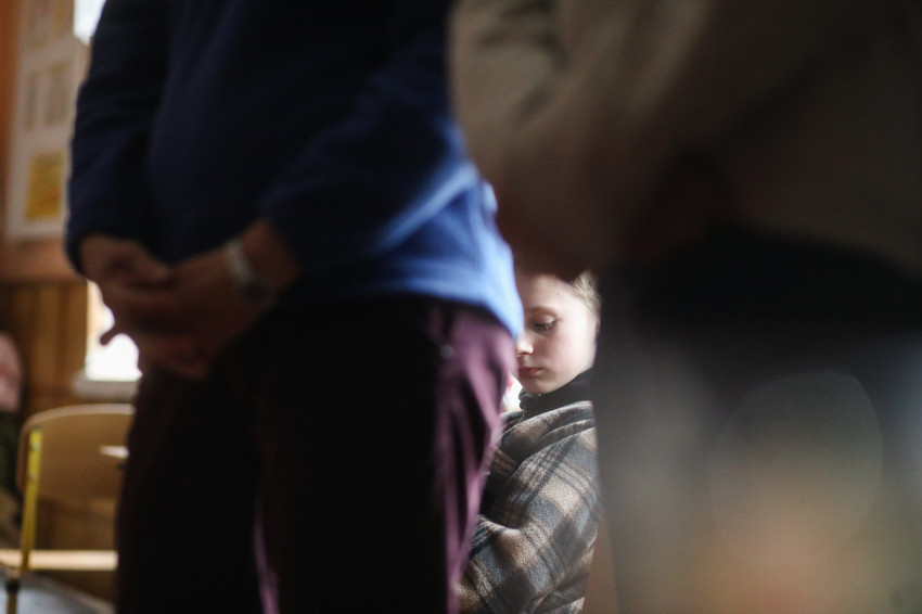 Az ukrán iskola épületében több mint hatvan menekült kapott szállást, többségében asszonyok gyerekekkel. Matracok, kempingágyak felállításával rendezték át az osztálytermeket hálótermekké. Egy termen általában több család osztozik, kivételt képez egy irpinyi nagy család. Három generáció érkezett együtt, a nagyszülők, a nagynéni és a szülők – az apuka is itt van – meg a gyerekek. Náluk is ugyanolyan szép rend van, mint mindenütt az egész épületben.Érkezésünkkor a házaspár magába roskadva ült, a nagymama a legkisebb fiúval beszélgetett. Március 8-a óta vannak itt.