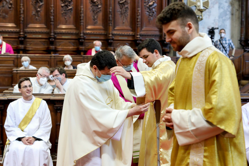 Ezután kapták meg a stólát és a miseruhát az Esztergom-Budapesti Főegyházmegye leendő papjai, majd a bíboros elmondta a felszentelés szavait, és megkente kezüket olajjal: