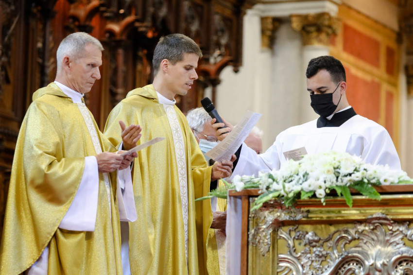A Mindenszentek litániája alatt a szentelendők a földre borultak, kifejezve önátadásukat a szolgálatra. Majd a bíboros elsőként egyesével a diakónusokért imádkozott, hatalmat adva nekik a szerpapi tisztségre. Miután a három fiatalt dalmatikába öltöztették, megkapták az evangéliumoskönyvet: