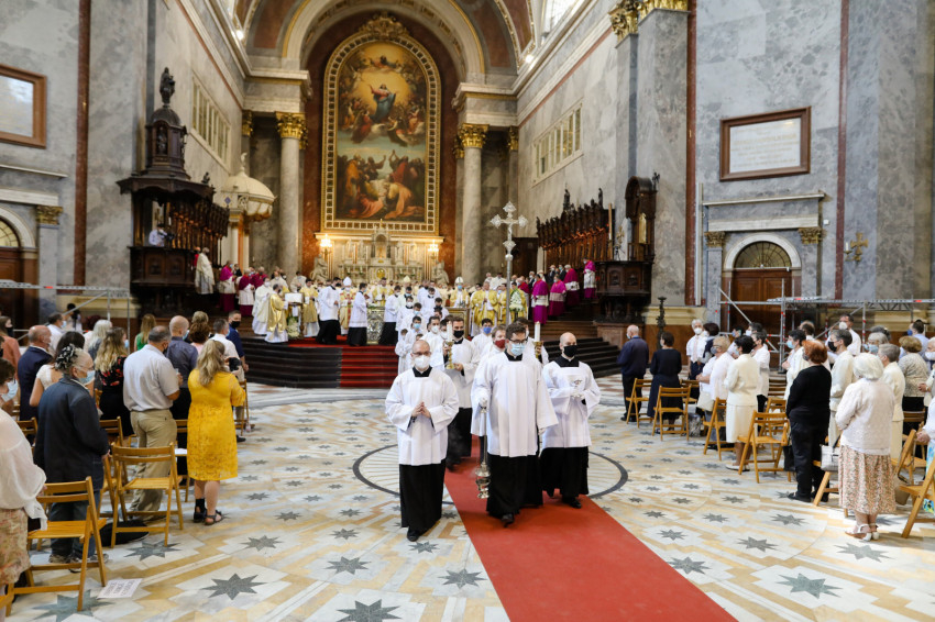 A bazilika orgonájának hangja töltötte be a templombelsőt, amikor az asszisztencia a bíboros fogadására vonult a főszékesegyház bejáratához. „Oltalmazó Isten, tekints le, és nézz fölkented arcára” – szólt a bevonulási ének, majd Erdő Péter köszöntötte a szentelendőket, a jubilálókat, és kifejezte örömét, hogy a járvány lecsengése lehetővé tette, hogy megteljen újra a bazilika ünneplőkkel.