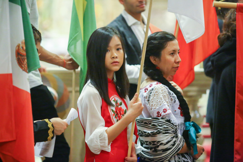 A Szent István-bazilikában hétről hétre igen sok náció képviselője megfordul, de a mostani színes forgatagot nem turisták alkották. Laudate omnes gentes (Dicsérje minden nemzet) – a jól ismert taizéi ének dallamára vonultak be hazájuk zászlajával a különböző népek képviselői, a spanyol nyelvűeknek még közös táblájuk is volt Misas en espanol (Spanyol nyelvű misék) felirattal.