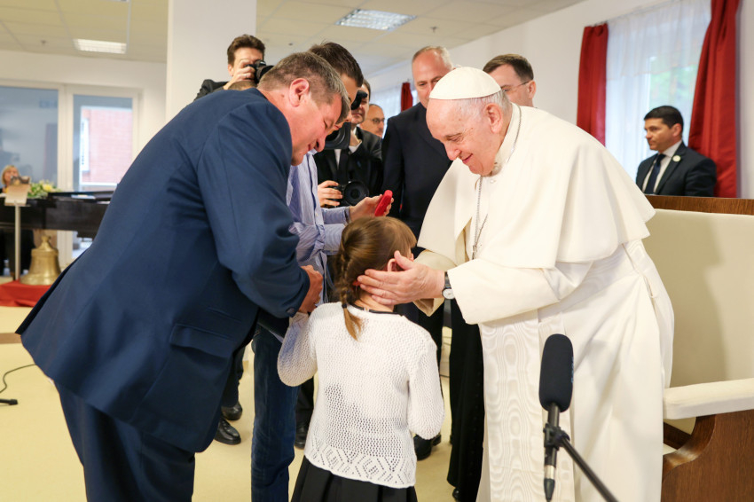Egy bentlakó kisfiút kértek meg, hogy csengessen, amikor érkezik a Szentatya. Ott állt közvetlenül a sajtósok előtt. Míg várakoztunk, kérdeztem őt, hogy ő fog-e kezet fogni a pápával, ha megérkezik. Majd az egyik ott dolgozó, aki a kérdésemet meghallotta, hozzám fordult, hogy ezt nem szeretnék a munkatársak, mert neki csúnya a keze. Így a fiú közvetlenül a csengetés után a helyére ment. A gyermekotthon lakói dalokkal készültek a pápának. Látszott a Szentatyán, hogy mélyen megérintette a gyerekek előadása. Beszédében elhangzott, hogy Jézus azért jött, hogy a valóságot elfogadja olyannak, amilyen. Majd az esemény végén Ferenc pápa odament a csengető kisfiúhoz is, és üdvözölte őt, megfogta a kezét.