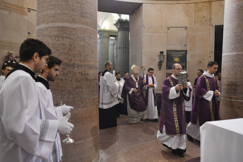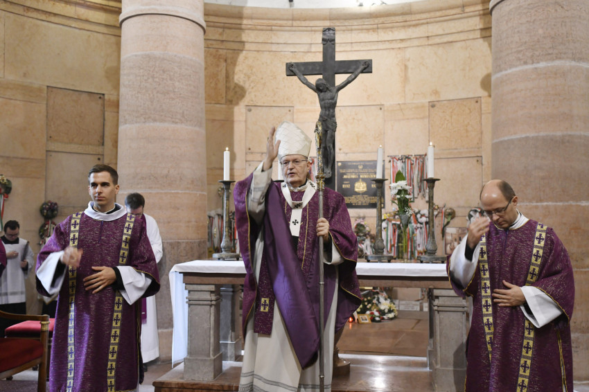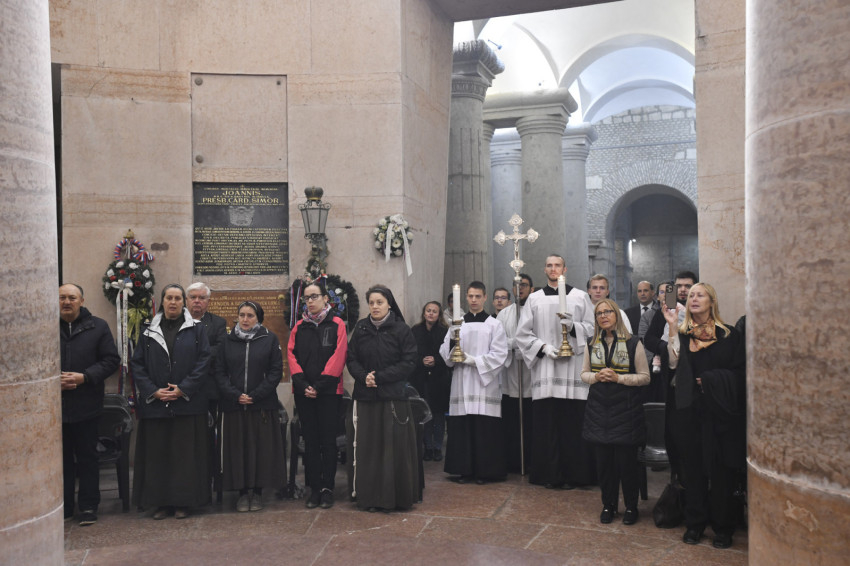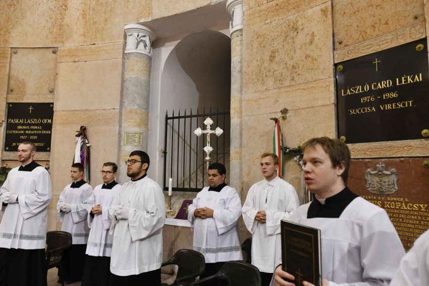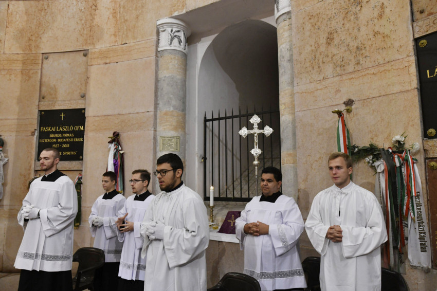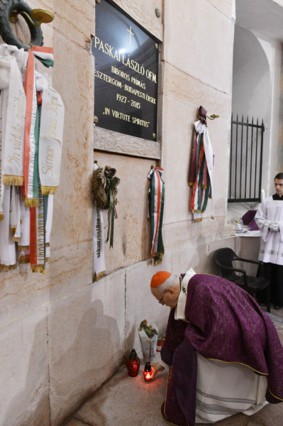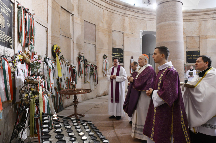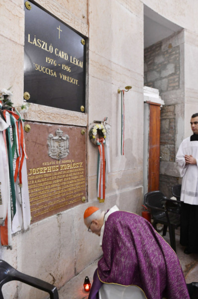 A liturgia végén a bíboros és az asszisztencia gyertyát gyújtott a főegyházmegye elhunyt főpásztorainak sírjainál.