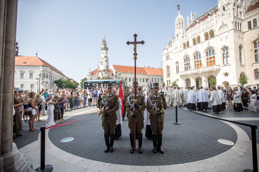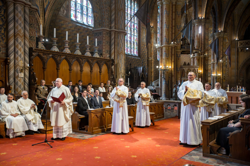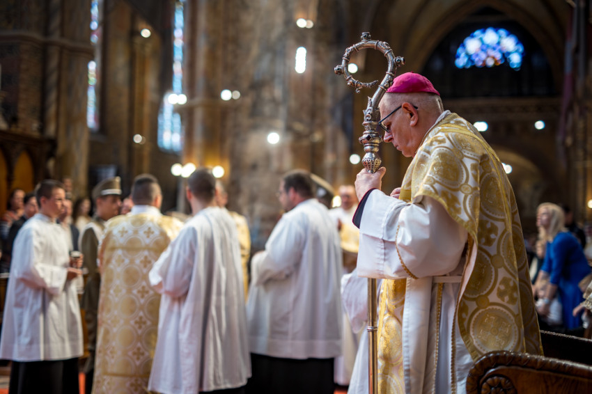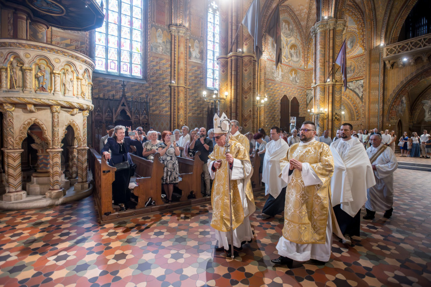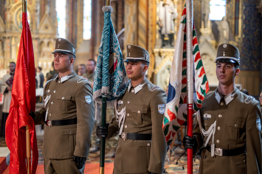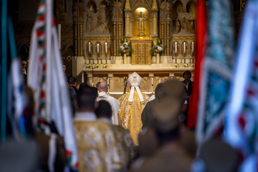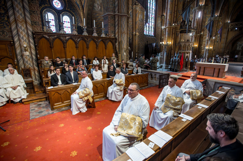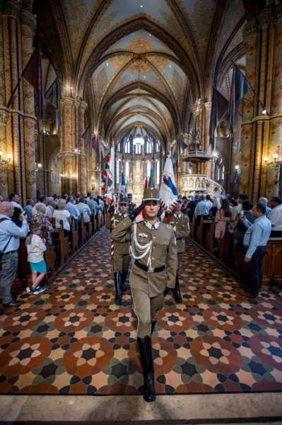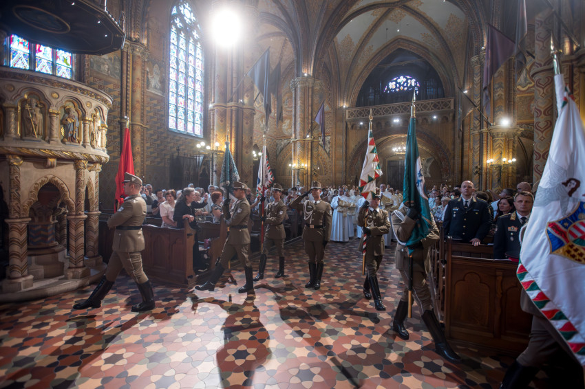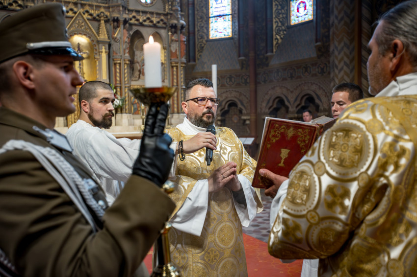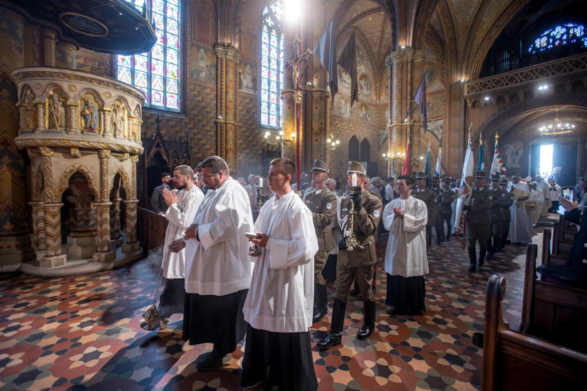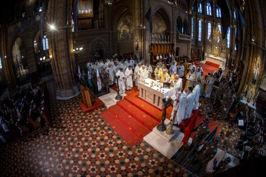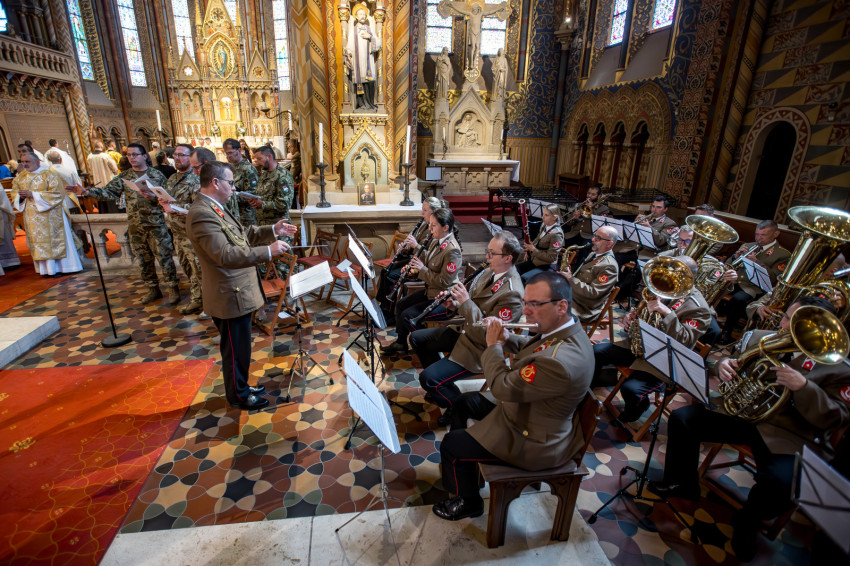 A Mátyás-templomban az ünnepi szentmise nagybevonulással kezdődött: díszegyenruhába öltözött katonák vitték elöl a zászlókat, utánuk a szentelendők és az asszisztencia következett, a zenei szolgálatot katonai ének- és zenekar látta el. A templom padjait megtöltötték az ünnepre érkezők.