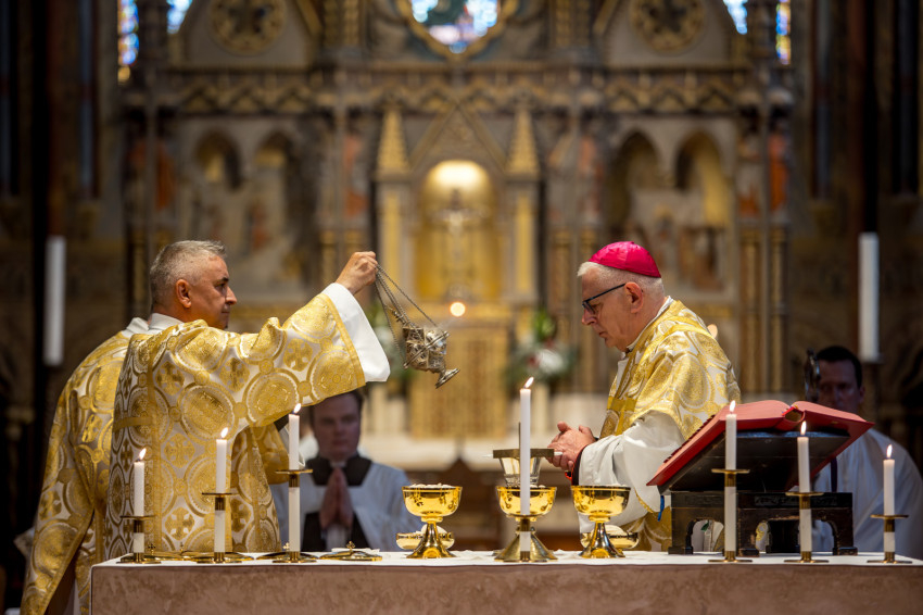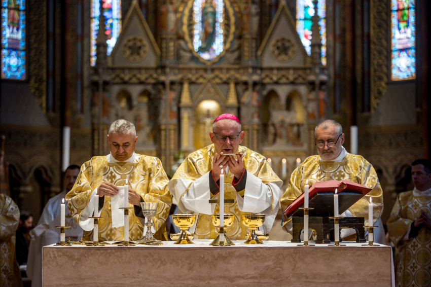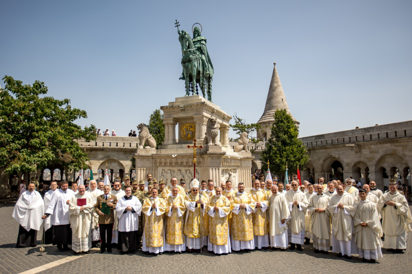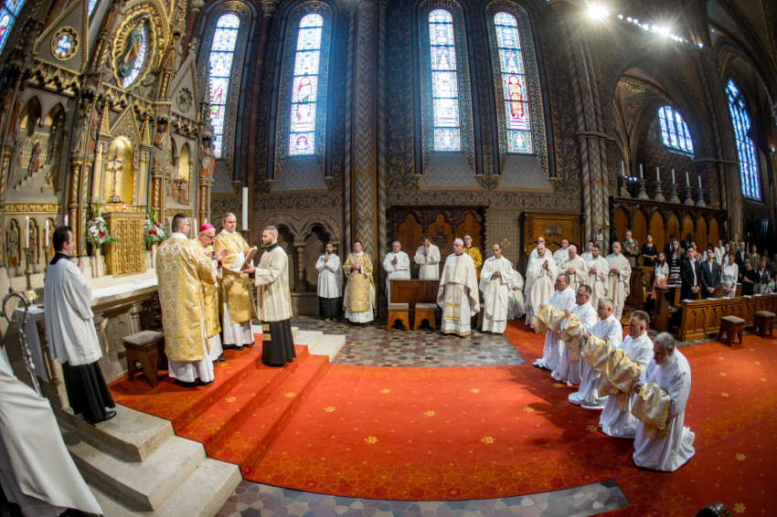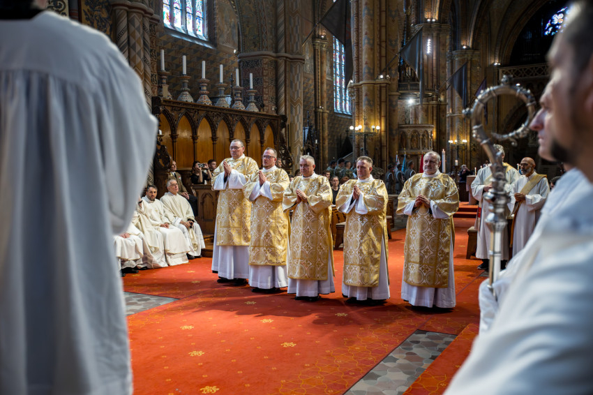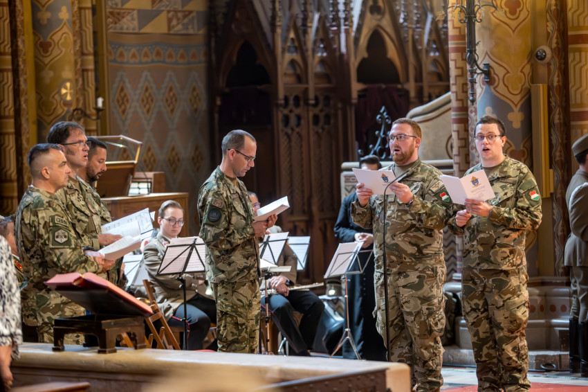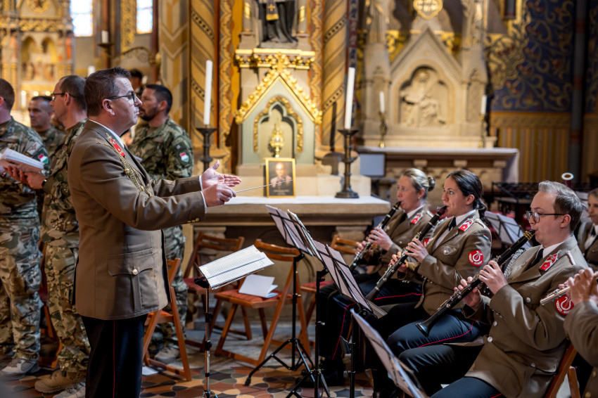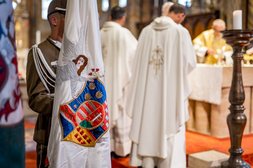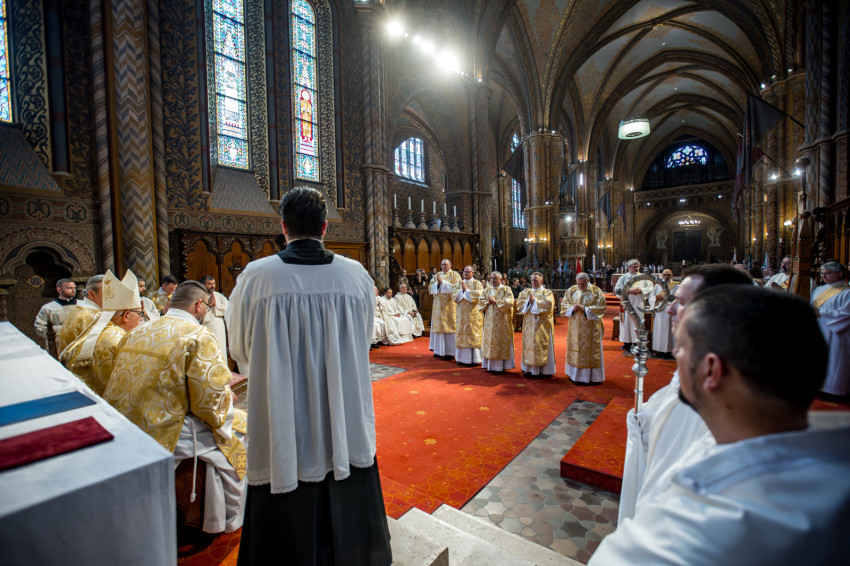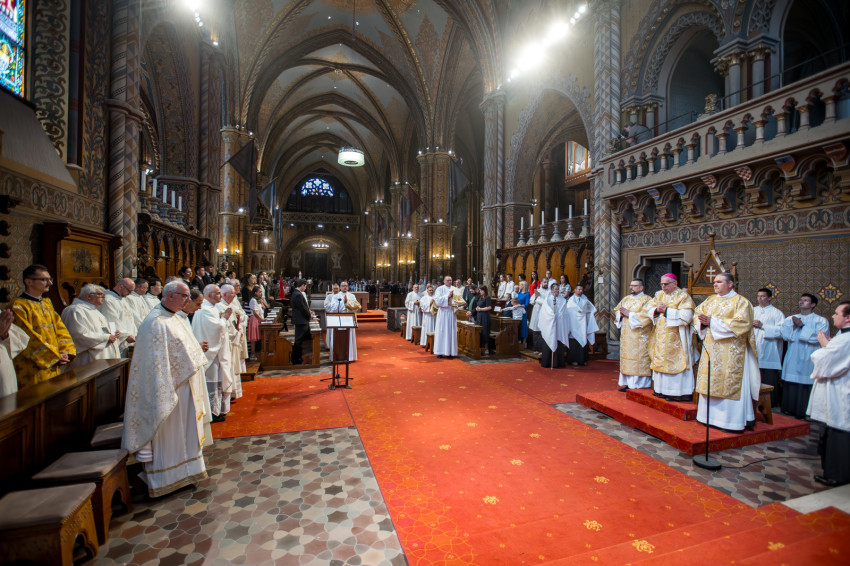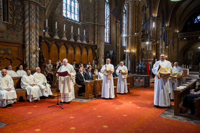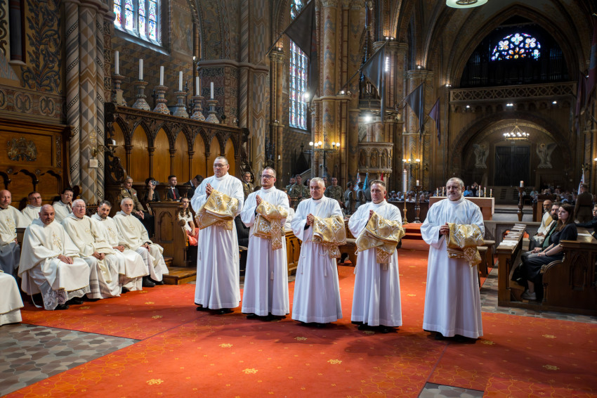 A Mátyás-templomban az ünnepi szentmise nagybevonulással kezdődött: díszegyenruhába öltözött katonák vitték elöl a zászlókat, utánuk a szentelendők és az asszisztencia következett, a zenei szolgálatot katonai ének- és zenekar látta el. A templom padjait megtöltötték az ünnepre érkezők.