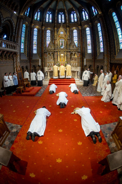 A szentbeszéd után a jelöltek fogadalomtétele következett: „Ígérsz-e engedelmességet nekem és utódaimnak? – Igérek. – Isten tegye teljessé a jót, amit megkezdett benned.” Ezután a püspök imádságra szólította fel a népet: „Most imádkozzunk kedves testvéreim, Istenhez, a Mindenható Atyához, hogy szolgájára, akit a szerpapság rendjébe kegyesen felvesz, árassza ki áldásának kegyelmét.” A jelöltek arcra borultak és a kórus, a hívekkel közösen – a húsvéti idő miatt – állva elénekelte a Mindenszentek litániáját.