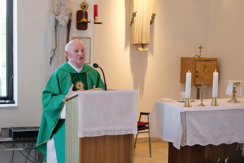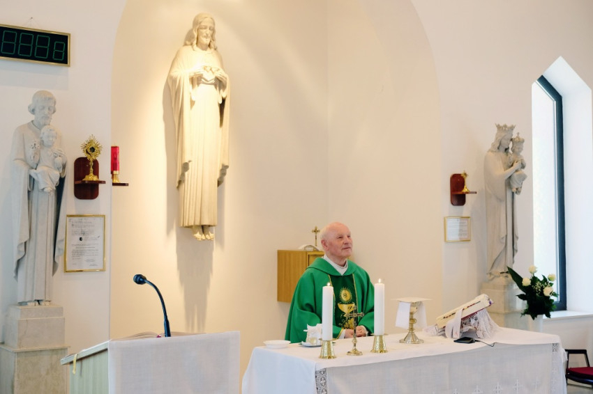 „Szeretetközösség hordoz bennünket – mondja Kozma atya a mise kezdetén, mintegy üdvözlésként. – Ennek a megjelenítője ez a ház is. Fontos, hogy egy ilyen zártabb közösségben is tudjunk tanúságot tenni a hitünkről, és világos legyen számunkra, hogy egymásért élünk. Szűz Mária-szobor avatására készülünk ma: Máriáéra, akire a középkori ember Jézushoz elvezető emberként gondolt. Ő Jézushoz vezessen el bennünket, Jézus pedig egymáshoz!