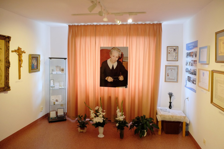 Az ünnepség után, az ebédlő felé tartva találkozunk Albel Gyulával, aki kedvesen az általa felügyelt emlékszobába invitál bennünket, amely az otthonalapító Jézus Szíve-nővér, a pilisvörösvári születésű, de az USA-ban szolgált Manhertz Erzsébet (1918–2010) életét és az idősgondozás, -ápolás általa kidolgozott Manhertz-elvét mutatja be.