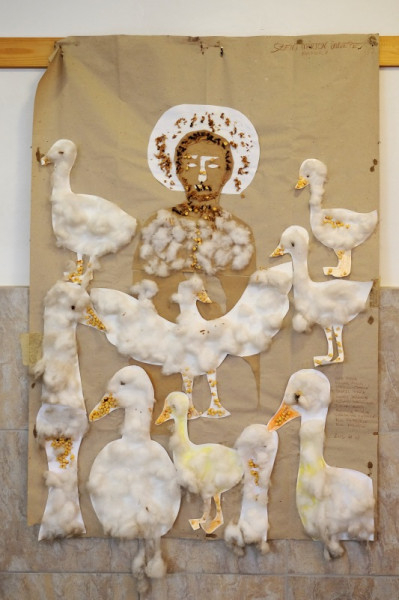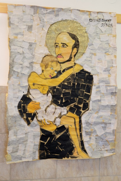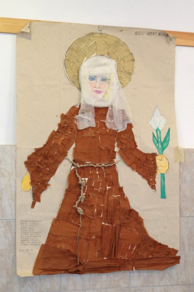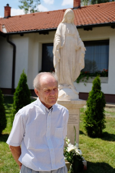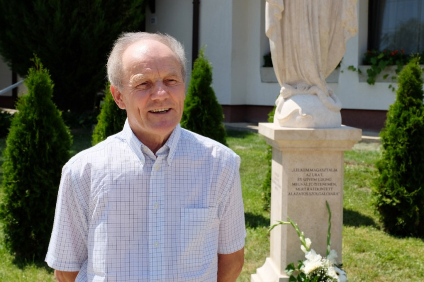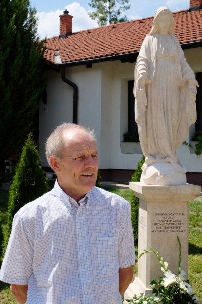 Ebéd után visszasétálunk a szoborhoz Sax László kőfaragó mesterrel, a kivitelezővel. Múlt évben egy közelben álló kőkeresztet restaurált, akkor kapta a megbízást, hogy az intézmény fennállásának huszonötödik évfordulójára készülve készítsen Szűz Mária-szobrot. Sokféle mintát tanulmányozott, míg ezt kiválasztotta. Régóta foglalkozik művészek alkotásainak kivitelezésével, épületek díszítőelemeinek elkészítésével, restaurálással.