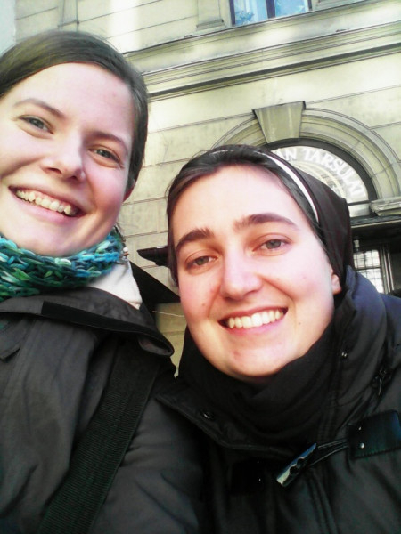A mellékelt képen Magó M. Teréz SFPS nővérrel vagyok látható, éppen nagyon vidulunk azon, hogy nem tudjuk, melyik pontot szuggeráljuk a mobil képernyőjén ahhoz, hogy jó legyen a szelfi. A Ferenciek terén készítettük Budapesten, ő már itt épp túl van egy vizsgán, én meg tanulás közben beütemeztem egy szünetet a találkozás kedvéért. Megérte!