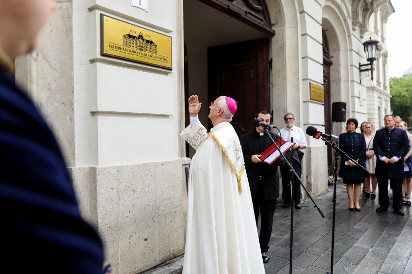 A szentmisét a Domus Universitatis és az Eszterházy Károly Katolikus Egyetem új névtáblájának megáldása követte. Szakadó esőben vonultak át az ünnepségen részt vevők a székesegyházból az Eszterházy téren át az egyetem épülete elé.