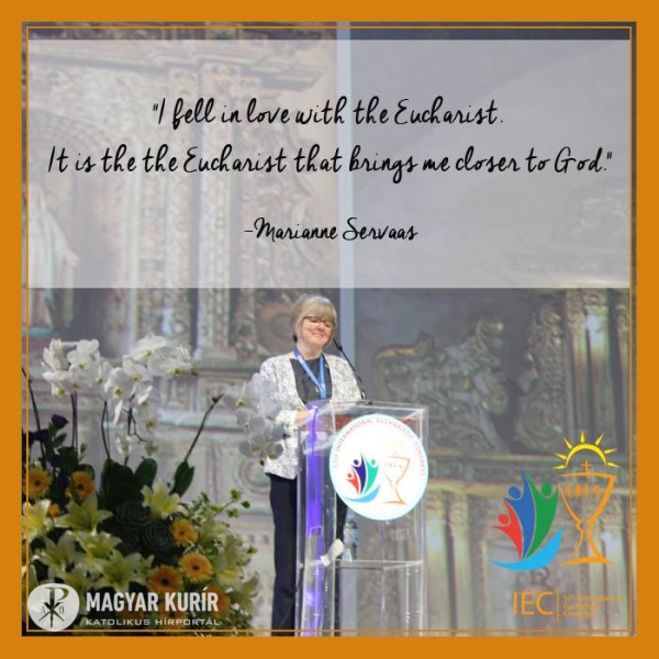 Robert Barron előadása után Marianne Servaas tanúságtétele következett, aki Belgiumból érkezett, ahol erősen szekularizált környezetben fáradozik a hit és az Oltáriszentség tisztelete élesztésén. Ő maga felnőttkorában tért meg, tudatos döntés révén. Sok keresztény közösséget ismert meg, de az is nyilvánvalóvá vált számára, hogy nem élhet egyfajta el nem kötelezett, felekezeten kívüli, „arctalan” kereszténységet. Két dolog volt, ami döntő hatást gyakorolt rá. Az első a Mindenszentek litániájának imádkozása volt – megkérdezte magától: tartozhatna-e ennél jobb családba? A másik az eucharisztikus jelenlét hite, amely a mai napig újra és újra tudatosítja benne, micsoda ajándék, hogy naponta szentáldozáshoz járulhat. Ebből remény fakad számára, különösen akkor, ha arra gondol: az egykor a legkatolikusabb nemzetek közé tartozó Belgium elhagyta hitét, múzeumnak tekinti a templomokat. Itt és most Krisztus jelenlétének reményadó erejére van szükség, hogy az ember ne vegyen fel negatív magatartást, beszédmódot, s a hitet se hagyja el. Örömteli és világos beszéd kell, melynek forrása az eucharisztikus közösség Istennel.