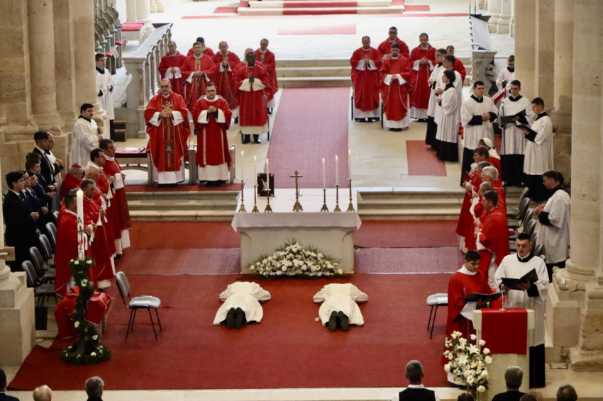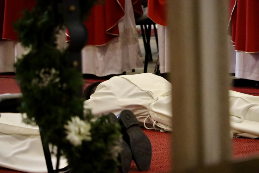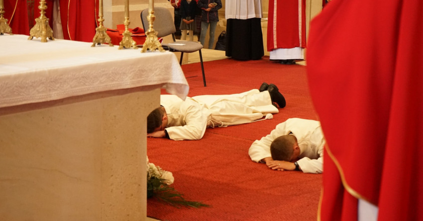 A homília után a jelöltek elmondták szentelési ígéreteiket, majd tiszteletet és engedelmességet fogadtak a mindenkori főpásztornak. Ezt követően, a teljes átadás jeleként földre borultak, miközben a Mindenszentek litániáját imádkozva a jelenlévők – köztük családtagok, rokonok, barátok és ismerősök – a gyulafehérvári székesegyházban a szentek közbenjárását kérték a jelöltekért.