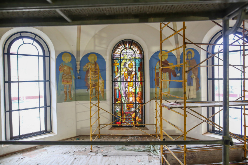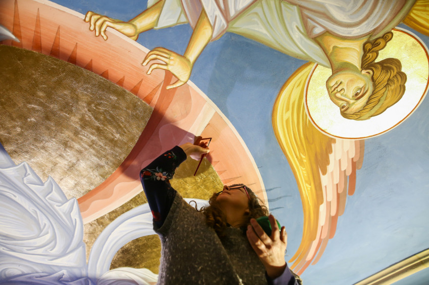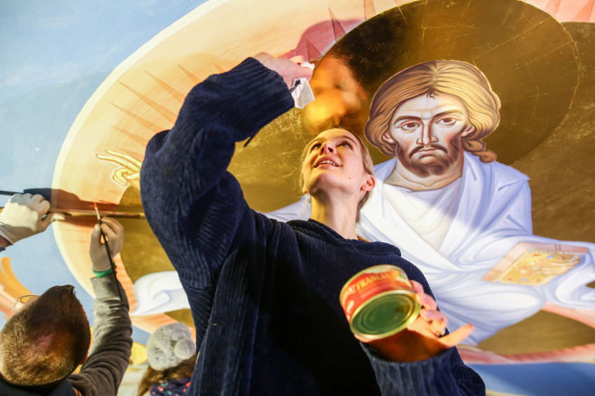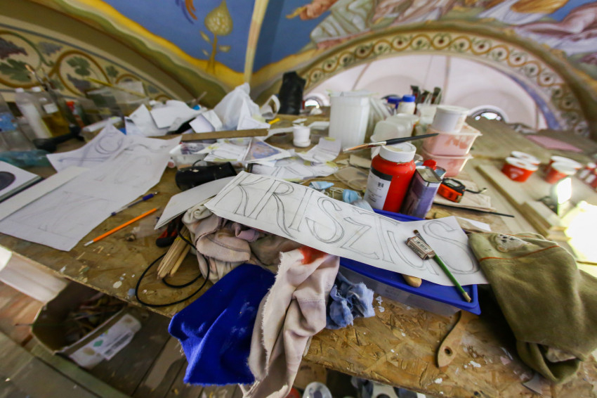 Éppen ezért felkapja az ember a fejét, ha egy templomban, ahol addig egyáltalán nem volt falfestmény, egyházi megrendelésre kortárs művészek dolgoznak a korábban üresen hagyott falfelületeken. Ez történik most a nyíregyházi görögkatolikus Szent Miklós-székesegyházban, ahol teljes körű felújítás zajlik: a fémcsöves-deszkapallós állványokon fiatal festőket, művészeket látni, akik serényen dolgoznak az azelőtt festetlen falakon.