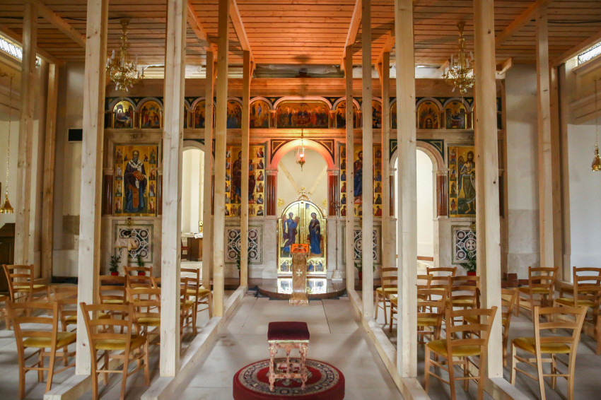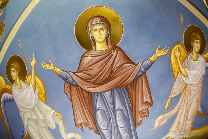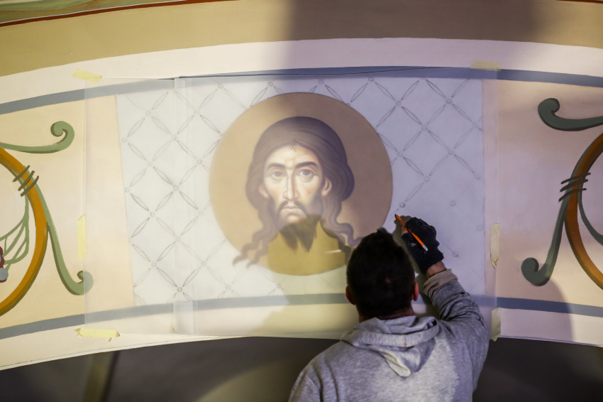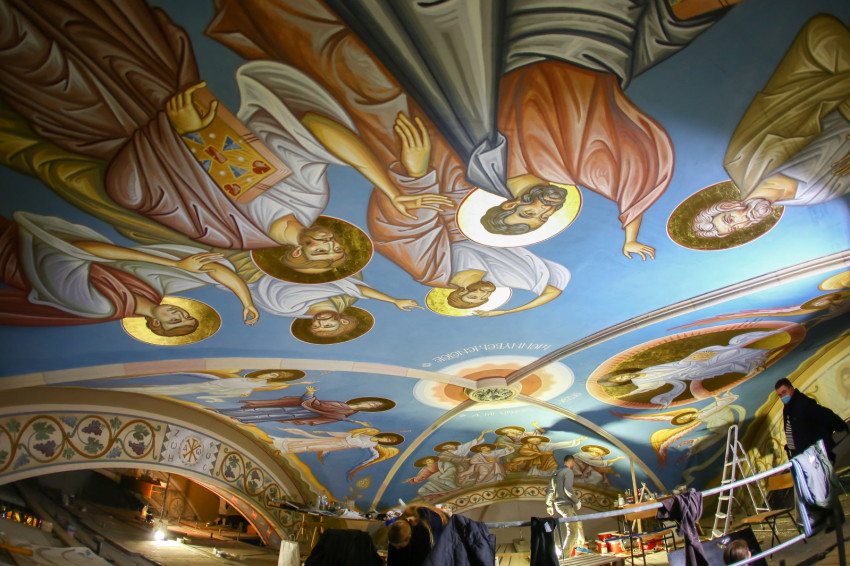 Tulajdonképpen ez a Pantokrátor képe, vagy legalábbis arra utal. Van ugyanis egy olyan kapcsolódási pont, hogy valamikor réges-régen valóban a mennybemenetel jelenetei kaptak helyet a kupolákban, oly módon, hogy a tamburon (kupoladob) oldalt álltak az apostolok, és középen volt a mennybe menő Krisztus alakja. Később ez némileg változott. Tulajdonképpen itt egy nagyon ősi képi program került fel a falra. Aztán elrendeztük a többi oldalfal programját. Lent, ha szemben állunk az ikonosztázzal, tőle jobbra Krisztus születésével indul majd a képsorozat, és egészen a feltámadásig tart, azzal fog befejeződni a túloldalon. Ehhez kapcsolódik majd a többi kép, az egyik oldalon Krisztus megkeresztelkedése lesz fenn a boltozaton, lent a kánai menyegző, a születés mellett. A világba érkezik az Üdvözítő, megteszi az első csodáját, a Szentháromság kinyilatkoztatja magát, és ez így tulajdonképpen egy ünnepkör.”