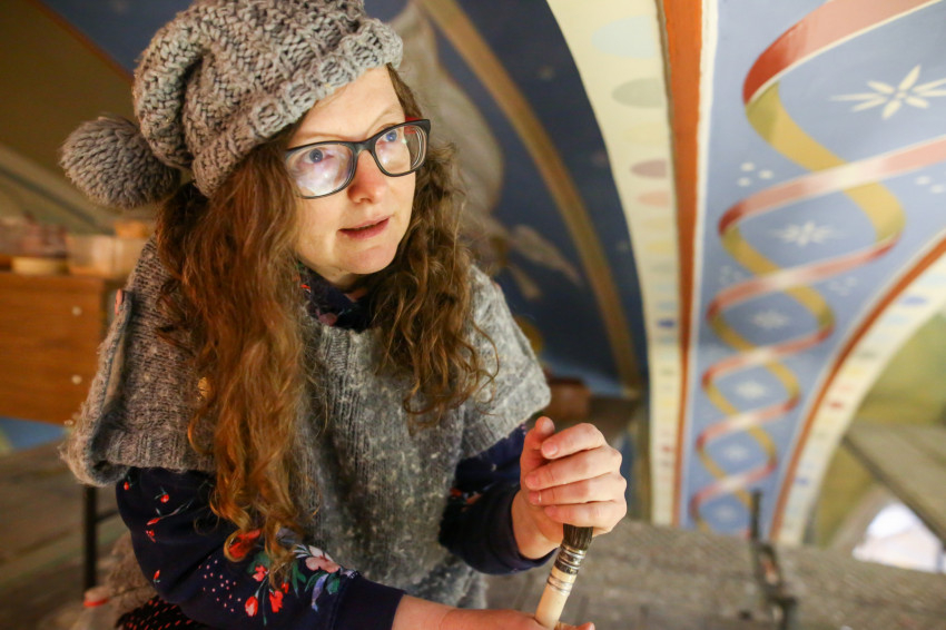 A fémlétrákon felmászva, a deszkapallóktól már csak két méterre van a mennyezet, itt elénk tárulnak a keresztboltozat készülő képei. Nem könnyű áttekinteni az egészet, hiszen nincs elég távolság, nem megfelelő a rálátás a falfestményekre, melyek munkálatai lassan a végükhöz közelednek. A fotózás során ezért főleg csak részleteket lehetett megörökíteni. Az viszont jól látható a képeken, hogy egy mosolygós, jókedvű, fiatal munkacsoport dolgozik ezen a hosszú ideje tartó projekten.