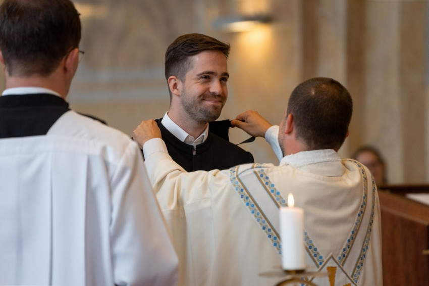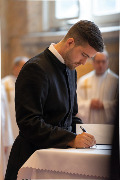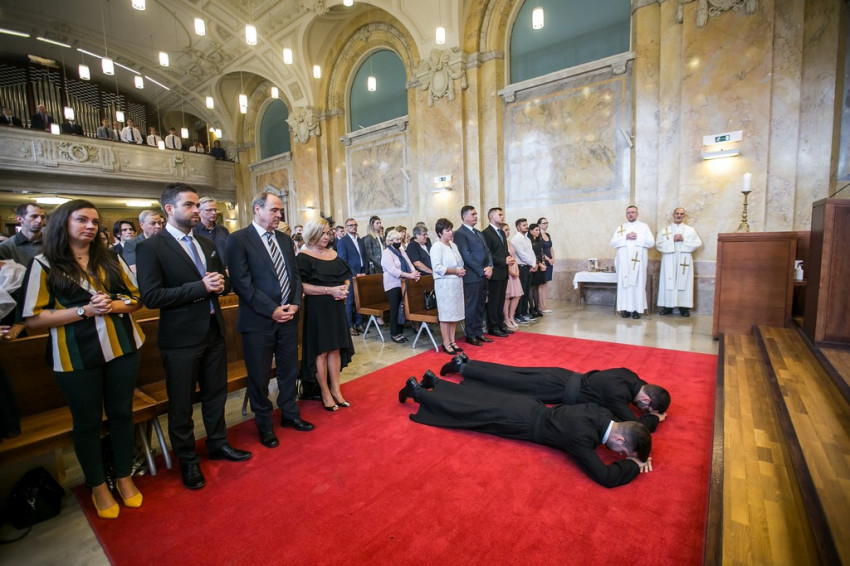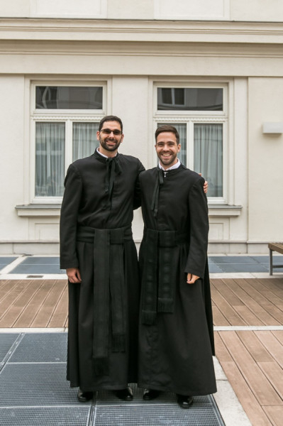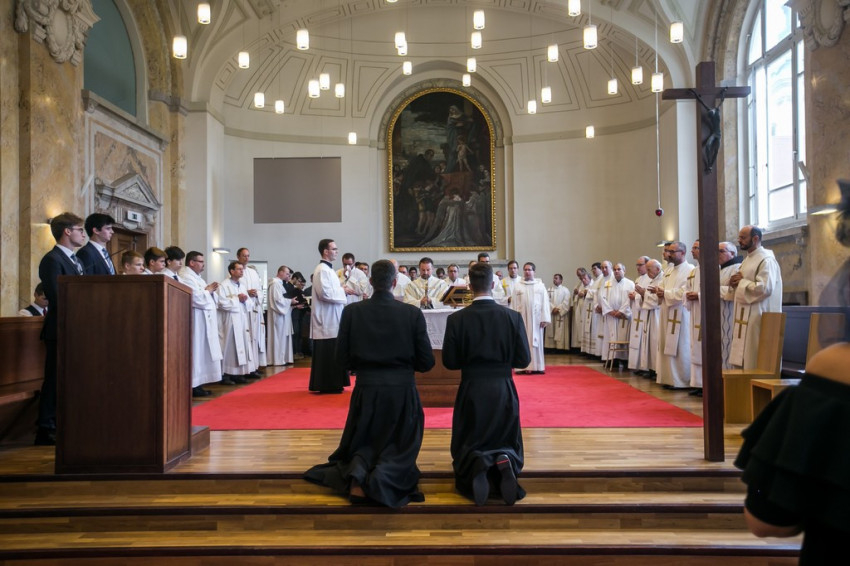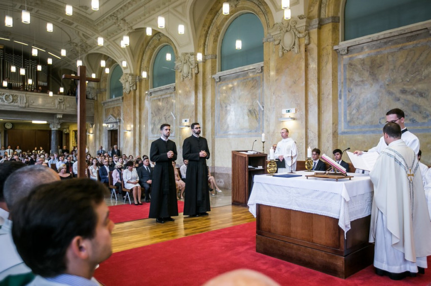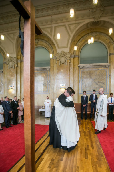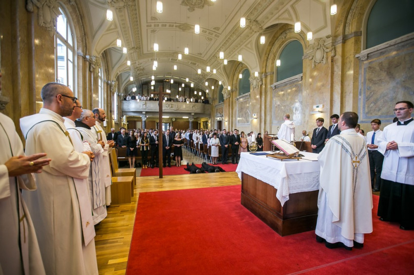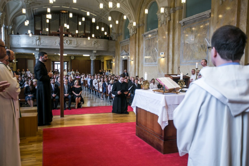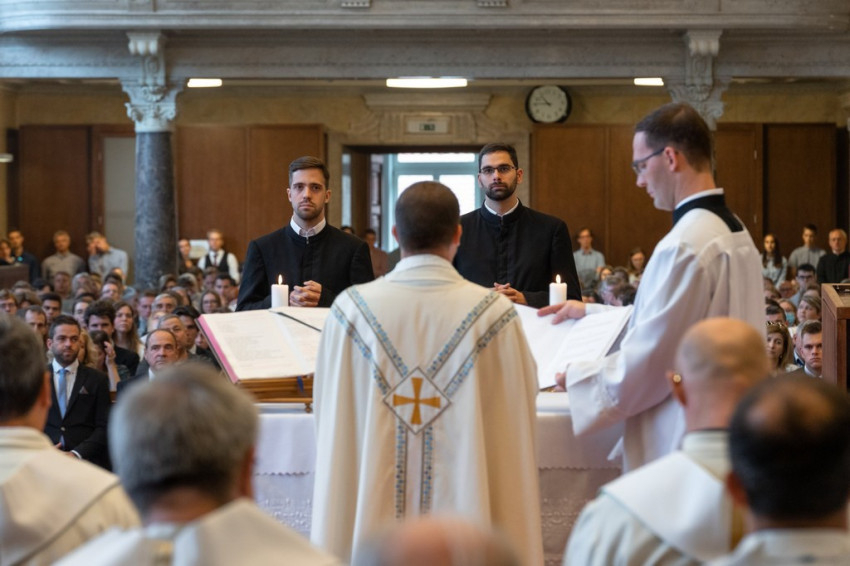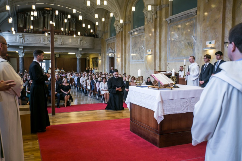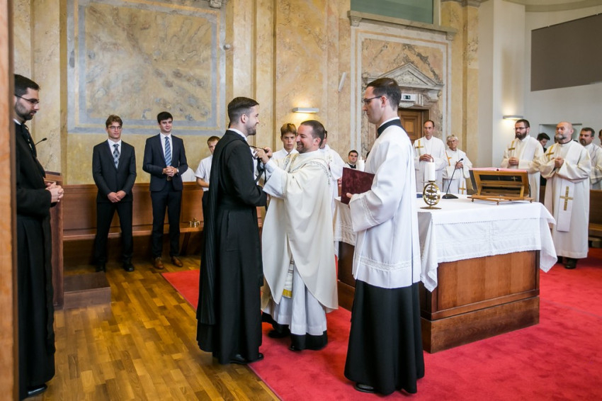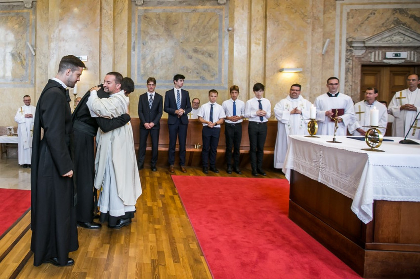 A zsúfolásig megtelt kápolnában családtagok, szerzetestársak, rokonok, barátok, valamint számos diák és öregdiáktárs lehetett tanúja az örömteljes eseménynek, ahogyan Szabó Dániel és Márkus Roland letette a szerzetesek hármas – szegénység, tisztaság és engedelmesség – fogadalmát, valamint a piaristák negyedik – különleges törődés a gyerekek és fiatalok nevelésében – fogadalmát.