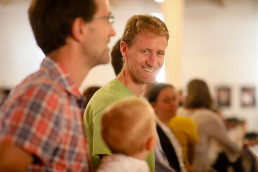 A közösség ezen a vasárnapon Sajgó Szabolcsot is ünnepli, 70. születésnapja alkalmából köszöntik. Mindenki beszélni akar vele; mikor meg tudjuk szólítani, az örömről beszél.