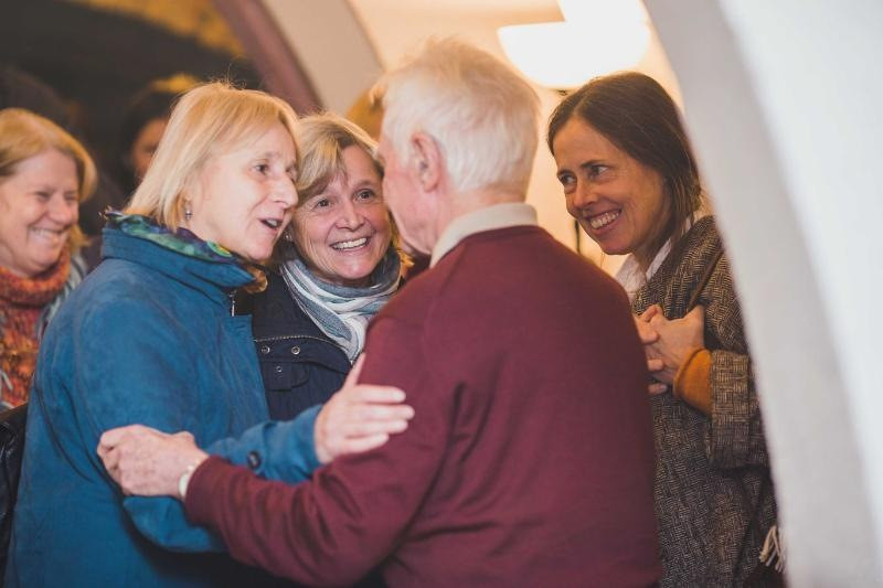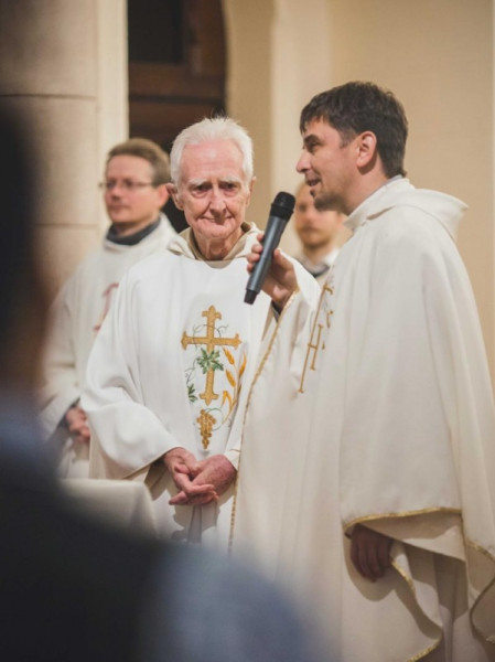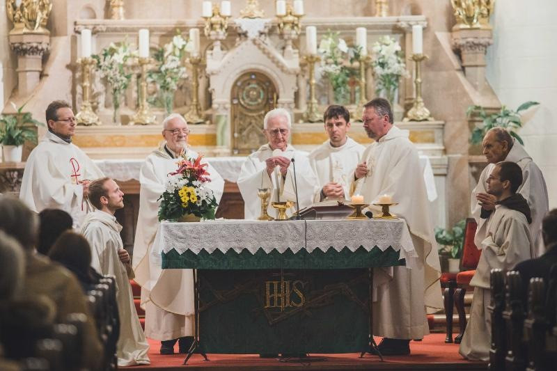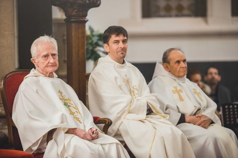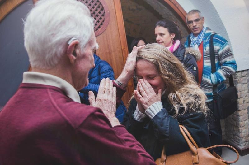 Mise után az altemplomban folytatódik az ünneplés: tortával, fotózkodással, sok-sok öleléssel és beszélgetéssel. Feri atyához akkora sor áll, hogy fél óra alatt sem lehet a közelébe jutni. A gyengéd gesztusoknak ez az áradata minden szónál többet mond a köztünk – és általunk is – megjelenő Isten országáról.
