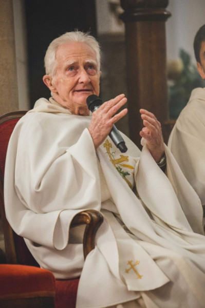 Hogy minél közelebb lehessenek az atyához, jó néhányan térdelőszékeken, az oltár körül helyezkednek el, a hangulat családias. Vízi Elemér tartományfőnök bevonulás utáni köszöntőbeszédében hálát ad az Úristennek azért, hogy népének és rendjének ajándékozta Jálics atyát, és az őt itthon és világszerte tisztelők-szeretők sokaságát emlegeti. – Imautat és életmódot tanítottál nekünk – mondja –, a műhelyednek minden magyar jezsuita a tanítványa volt, mert szerettél és befogadtál bennünket. A szemlélődő lelkigyakorlat mestere vagy, erre tetted fel az életedet.