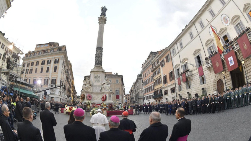 Homíliájában bátorított: „engedjük, hogy a mai napon kézen fogjon minket a Szűzanya. […] benne nyoma sincs a rossznak, és ezért Isten vele akarta megkezdeni az üdvösség és a béke új történetét. Itt fordult meg a történelem sora. Isten azáltal változtatta meg a történelmet, hogy bekopogott Mária Szívének ajtaján.”