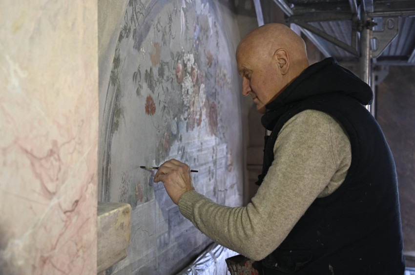 – Perger Gyula atya megbízásából a püspöki palota Szent Pál termével, Stefan Dorffmeister pannóinak restaurálásával kezdtem a szombathelyi munkáimat. Korábban három hozzá tartozó település, Torony, Sé, majd Kőszeg egyik templomának díszítőfestését végeztem el, illetve figurális kompozíciókat is terveztem. Már nyolc-kilenc templomban dolgoztam a Szombathelyi Egyházmegyében a zalaegerszegi ferencesektől Szentkirályig, úgyhogy e referenciáknak köszönhetően megelőlegezték nekem a bizalmat a szombathelyi püspöki palotában is. 2018 őszén kezdtem el a Szent Pál terem hatalmas olajfestményeinek restaurálását, amivel több mint félévi munka után a következő év tavaszán végeztem. Ezután a megyéspüspök úr, Székely János és Perger Gyula közösen úgy döntöttek, hogy engem kérnek fel a díszterem Maulbertsch, illetve három név szerint ismert segítője által festett mennyezetképének restaurálásával is. Hatalmas feladat volt, hiszen egy száznegyven négyzetméteres alkotásról beszélünk. 2019 őszén kezdtem el, és 2020 szeptemberében bontották el az állványzatot, amelyről dolgoztam. A terem már majdnem kész, jelenleg az utoljára hagyott keleti fal díszítőfestésének helyreállítása zajlik.