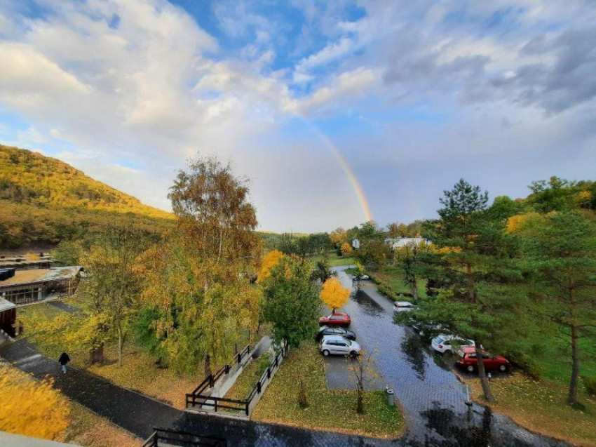 A csodálatos szépségű völgy magával ragadó és békét árasztó volt a szomorkás idő ellenére is. A szállásunk átvétele után még volt egy kis időnk a lelkigyakorlat kezdete előtt, így sétáltunk egyet a környéken. Kisütött a nap, és gyönyörű szivárvány tűnt fel az égen.