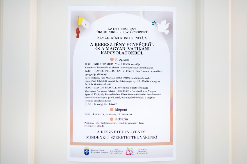 A mostani konferenciára két előadó érkezett Rómából, akiket október 23-án Erdő Péter bíboros, prímás is fogadott. James Puglisi engesztelő ferences szerzetes (a Franciscan Friars of the Atonement tagja), az ökumenikus párbeszéd előmozdítását szolgáló római Centro Pro Unione emeritus igazgatója (Yves Congar – a II. Vatikáni Zsinat kiemelkedően jelentős teológusa – tanítványa – a szerk.) a PPKE Hittudományi Karán megtartott konferencián az ökumenizmus kezdeteiről beszélt. Davide Bracale történész, jogász pedig a 20. század elejének vatikáni–magyar diplomáciai kapcsolatairól tartott előadást, különös tekintettel nagybátyja, Nazareno Patrizi egyházjogásznak az Apostoli Szentszék fellebbviteli bírósága (Rota Romana) tagjaként végzett küldetésére.