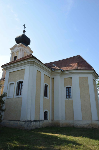 A településen átmenő út kanyarulatában, kis dombon áll a keletelt késő barokk templom. A szentély mögött középkori temetőt azonosítottak a régészek. A háromrészes főhomlokzat középső szakaszában nyílik a kőkeretes bejárat, felette magas attikafalon emelkedik az órapárkányos, hagymasisakos torony. Az attikafal ad helyet az építtető házaspár kettős kőcímerének. A homlokzatokat lizénák és mélyített tükrök tagolják, egységesen körbefutó lábazat és tagolt koronázópárkány fogja össze a szabálytalan görögkereszt alaprajzon tagolt tömegű templomtestet. A toronyaljból modern vasrácson át kétszakaszos hajó nyílik, csehsüveg-boltozatát a hevedereken és a záradékban egyszerű profilú keretezés tagolja. Az első szakasz felét a falazott, hasábos pilléreken és kosáríves boltíveken nyugvó, egyenes mellvédű orgonakarzat foglalja el. A tágas egyhajós hosszházhoz kosáríves diadalív közvetítésével keskenyebb, kívül-belül szabálytalan poligonális, nyújtott szentély csatlakozik.