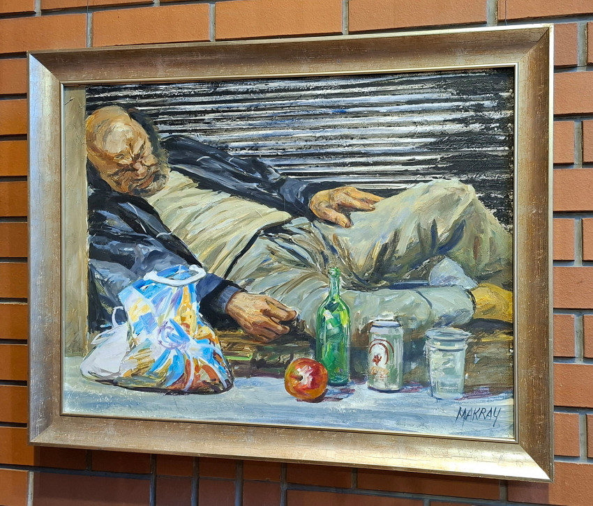Az Irgalom című alkotás „kilóg a sorból”. Egy szerencsétlenül járt hajléktalant ábrázol, aki az út mentén fekszik, körülötte szatyor, alma, üveg és poharak. Feszes a kompozíció, az alvó alak, aki talán jobb sorsról álmodik, szinte szétfeszíti a keretet.