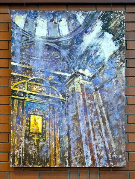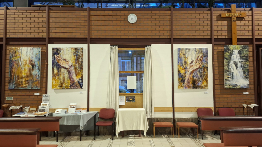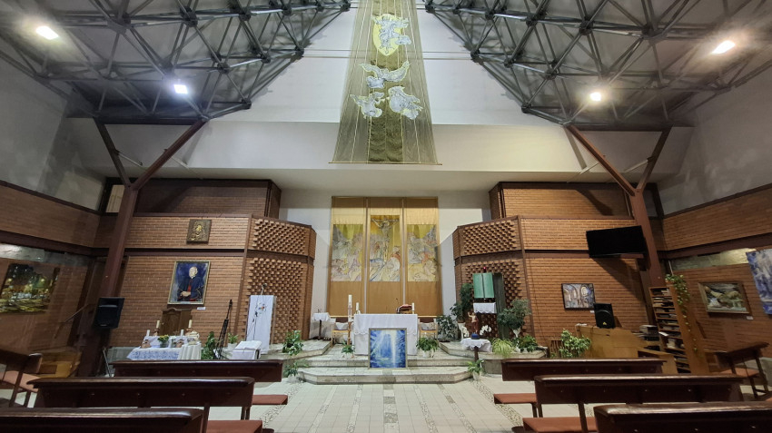 Még sohasem jártam az épületben, azt gondoltam, irodaház lehet, közelebb érve azonban rájöttem, hogy ez bizony egy templom. Még tartott a mise, amikor beléptem az ajtón, Gájer László atya, tanszékvezető egyetemi tanár éppen a befejező résznél tartott. Ezt mondta: „Kérjük, áldd meg ezeket a képeket, mindegyiket itt a templomban, amelyeket a te tiszteletedre készítettek és szeretettel festettek. A te bőkezűségedből nyert ajándékok ezek. Töltsd el a szívünket szent Lelked örömével, miközben nézzük ezeket a képeket. Krisztus, a mi Urunk által.”