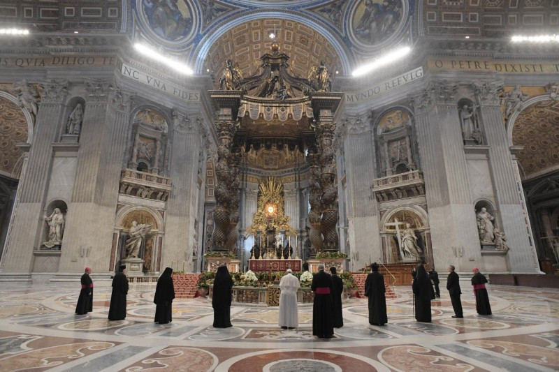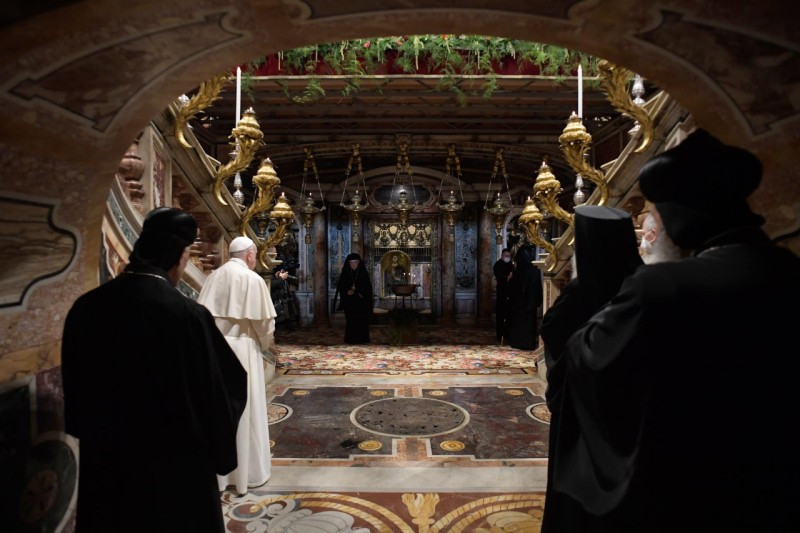 Rövid csend után a Szentatya lement Szent Péter sírjához, ahol egy gyertyát helyezett el, majd a jelen lévő tíz egyházi vezető is.