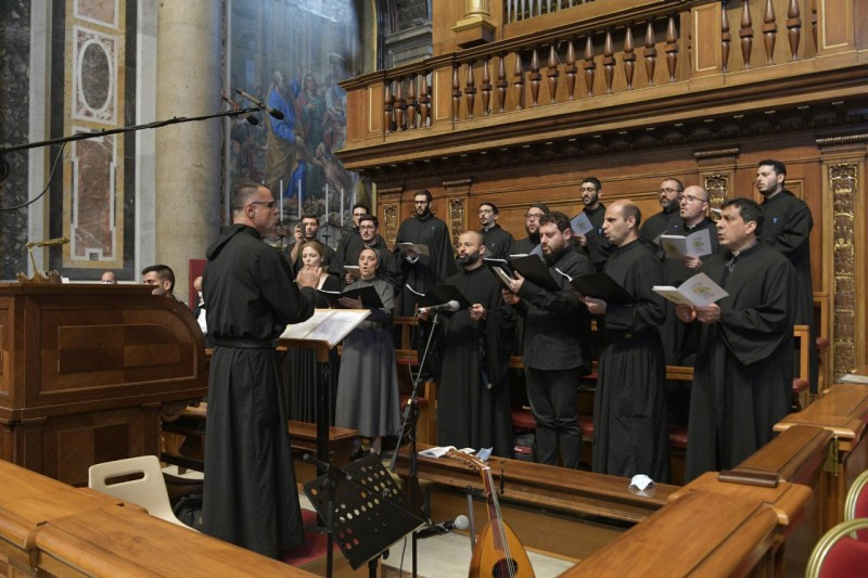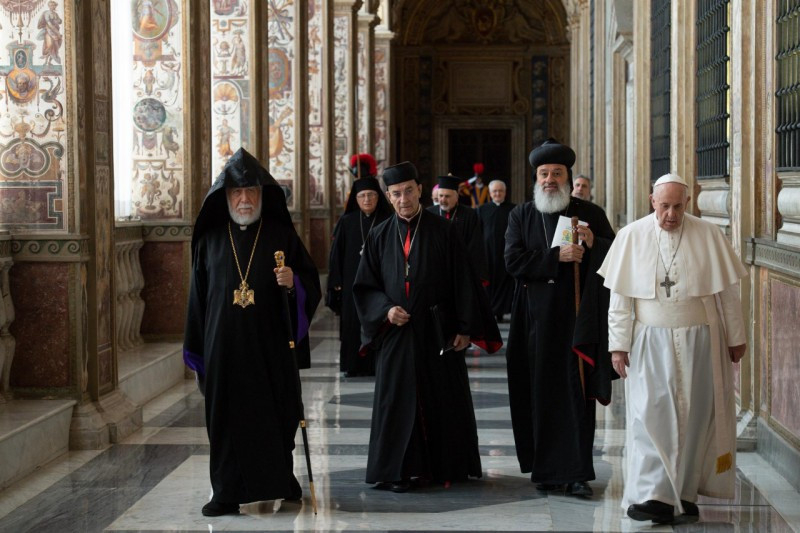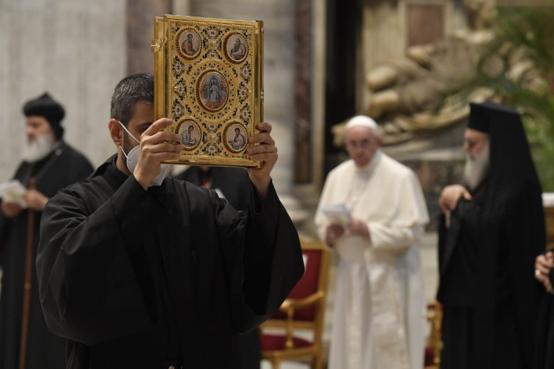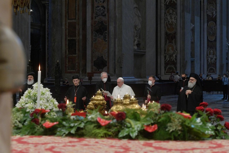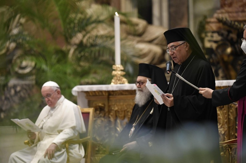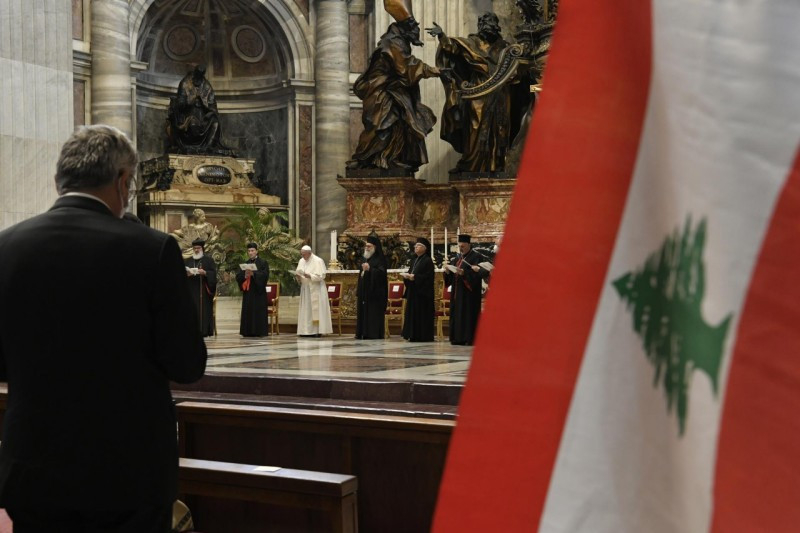 A Szentatya a Szent Márta-háznál köszöntötte a vendégeket, majd átmentek a Szent Péter-bazilikába, ahol a Péter sírja fölött álló oltár előtt elimádkozták a pápa vezetésével a Miatyánkot, amelyet a libanoni keresztény egyházak vezetői arabul mondtak el.