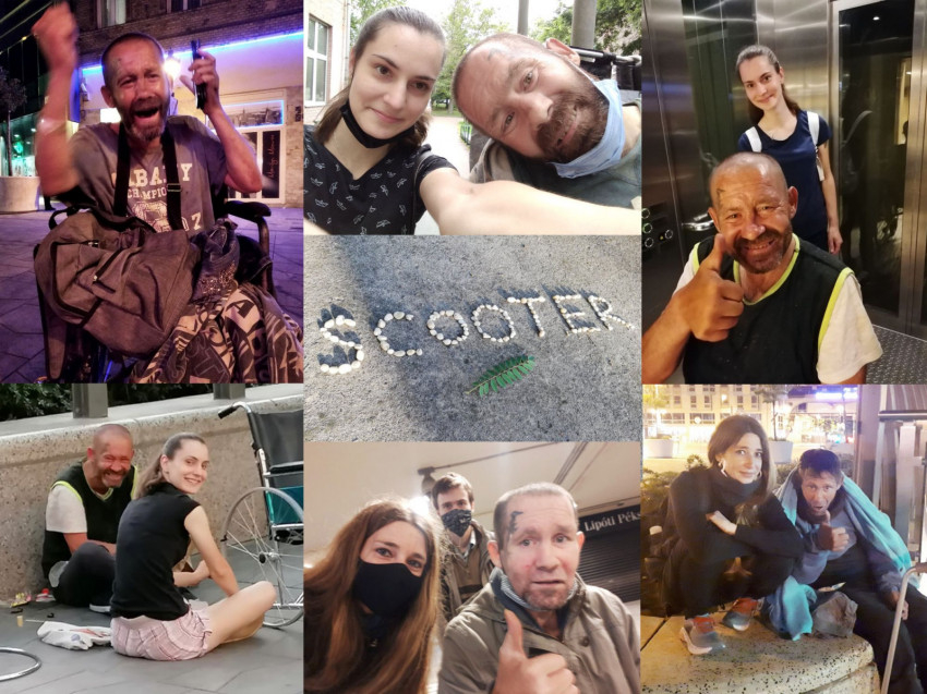 A Kálvin téren jött a hír, hogy feltámadt. Azt sem tudtam, hogy meghalt. Meg hogy ki. Aztán ott ült, a kiszolgáltatottság tolókocsijában, vizeletszagúan, térdig csúszott magatehetetlenséggel, meg egy nagy plédnyi humorral az ölében, ami mindezt beborította. ’96 óta élt a Kálvin téren, de egy évre eltűnt, mindenki úgy tudta, hogy meghalt. Látszott a szemén, hogy nagy vagány. Meg az is, hogy hatalmas szíve van. „Ő Scooter” – mutatták be nekem a Sant’Egidio (Szent Egyed) közösség régebbi tagjai. De nemcsak a becenevét tanultam meg aznap, hanem azt is, hogy mi az igazi jószívűség, mikor Scooter meg akart hívni kávéra abból a pár száz forintból, amit aznap összekoldult.