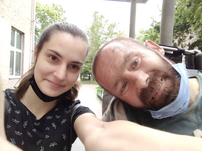 Másnap kimentem kötszerrel, fertőtlenítővel, sok liter vízzel felszerelkezve, hogy ha nem hagyja, hogy bevigyem, hát megcsinálom én. Mire kiértem, olyan állapotban volt, hogy nem volt kérdés, hívtam a mentőket. A földön feküdt, a lába felismerhetetlenre deformálódott (cipője már nem volt), mindenhol hemzsegtek rajta a kukacok. A tudata sem volt egészen tiszta. Több mint három óra várakozás és négy segélyhívás, adatfelvétel után értek ki a mentők. Közben Scooter újra és újra elfelejtette, hogy mentőre várunk, és minden alkalommal megijedt, kérlelt, hogy ne hívjam ki őket, meg fogják verni, el is akart menekülni. Mondtam neki, hogy bemegyek vele. Akkor belenyugodott. A kiérkezett mentősök nagyon rendesek voltak, bevittek engem is vele. A Balesetiben sok órát vártunk, Scooter közben tudott aludni, amikor felocsúdott, mindig értem kiáltott, azt tudta, hogy mellette vagyok, de hogy hol vagyunk, mi történik, azt mindig újra el kellett neki mondani. Akkor kerültünk sorra, mikor már mindenki más végzett, azok is, akik utánunk jöttek. Kitisztították a sebét, és bekötötték a lábát. Kérdeztem, hogy további kezelést nem igényel-e, azt mondták részükről ennyi. A hordágyról sem segítettek áttenni a tolókocsijába, nézték, ahogy egyedül próbálkozom, a teljesen kilátástalan helyzetben végül egy betört fejű munkásember lépett oda segíteni. Aztán kiraktak minket. Visszatoltam Scootert a Kálvin térre.